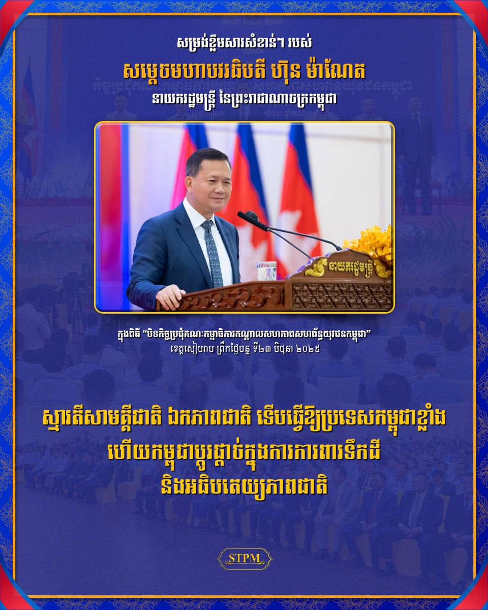 សម្ដេចមហាបវរធិបតី ហ៊ុន ម៉ាណែត នាយករដ្ឋមន្ត្រី នៃព្រះរាជាណាចក្រកម្ពុជា បានថ្លែងនៅក្នុងពិធីបិទកិច្ចប្រជុំគណៈកម្មាធិការកណ្ដាលសហភាពសហព័ន្ធយុវជនកម្ពុជា (ស.ស.យ.ក.) នាព្រឹកថ្ងៃទី២៣ ខែមិថុនា ឆ្នាំ២០២៥ ថា ស្មារតីសាមគ្គីជាតិ ឯកភាពជាតិ ទើបធ្វើឱ្យប្រទេសយើងខ្លាំង ហើយកម្ពុជាប្ដូរផ្ដាច់ក្នុងការការពារទឹកដី និងអធិបតេយ្យភាពជាតិ ។ ជាមួយគ្នានេះ, សូមគុណដល់ ស.ស.យ.ក. ដែលបានរៀបចំព្រឹត្តិការណ៍ដើរថ្មើរជើងរួមគ្នា បានបង្ហាញពី ការចូលរួមក្នុងស្មារតីស្នេហាជាតិ និង សាមគ្គីភាពជាតិ ក្នុងការគាំទ្ររាជរដ្ឋាភិបាល និងកងទ័ពកម្ពុជា ដែលបានធ្វើត្រូវ ក្នុងការ ការ ពារអធិបតេយ្យ, បូរណភាពទឹកដី និងកិត្តិយសជាតិរបស់យើង។ ស្មារតីជាតិនិយម និង ស្មារតីស្នេហាជាតិ ទាំងនេះ គឺជាស្មារតីត្រឹមត្រូវ និងពិតប្រាកដ របស់ប្រជាជនកម្ពុជា ដែលក្នុងកាលៈទេសៈនេះ ប្រជាជនកម្ពុជាមានស្មារតីជាតិនិយម និង ស្មារតីស្នេហាជាតិខ្ពស់បំផុត និងមិនមានអ្នកណាអាចបំបែកបំបាក់ស្មារតីទាំងនេះបានឡើយ ទោះបីជាកម្ពុជា ជាប្រទេសតូចក៏ដោយ។ រាជរដ្ឋាភិបាលកម្ពុជា មិនបានទៅបំផុសចលនាជាតិនិយមឡើយ ប៉ុន្តែប្រជាជនកម្ពុជា មានចលនាជាតិនិយមដោយខ្លួនឯង ដើម្បីចូលរួមការពារជាតិ និងបូរណភាពទឹកដីរបស់កម្ពុជា។ បន្ថែមពីនេះ, យុវជននៅតែជាធនធានដ៏សំខាន់ក្នុងការចូលការពារ និងកសាងជាតិគ្រប់កាលៈទេសៈ តាំងពីអតីតកាល មកដល់បច្ចុប្បន្ន និងបន្តទៅអនាគត ។