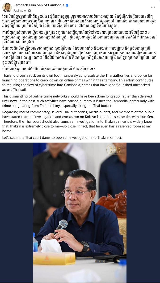 Regarding recent commentary, several Thai authorities, media outlets, and members of the public have stated that the investigation and crackdown on Kok An is due to his close ties with Hun Sen. Therefore, the Thai court should also launch an investigation into Thaksin, since it is widely known that Thaksin is extremely close to me—so close, in fact, that he even has a reserved room at my home.