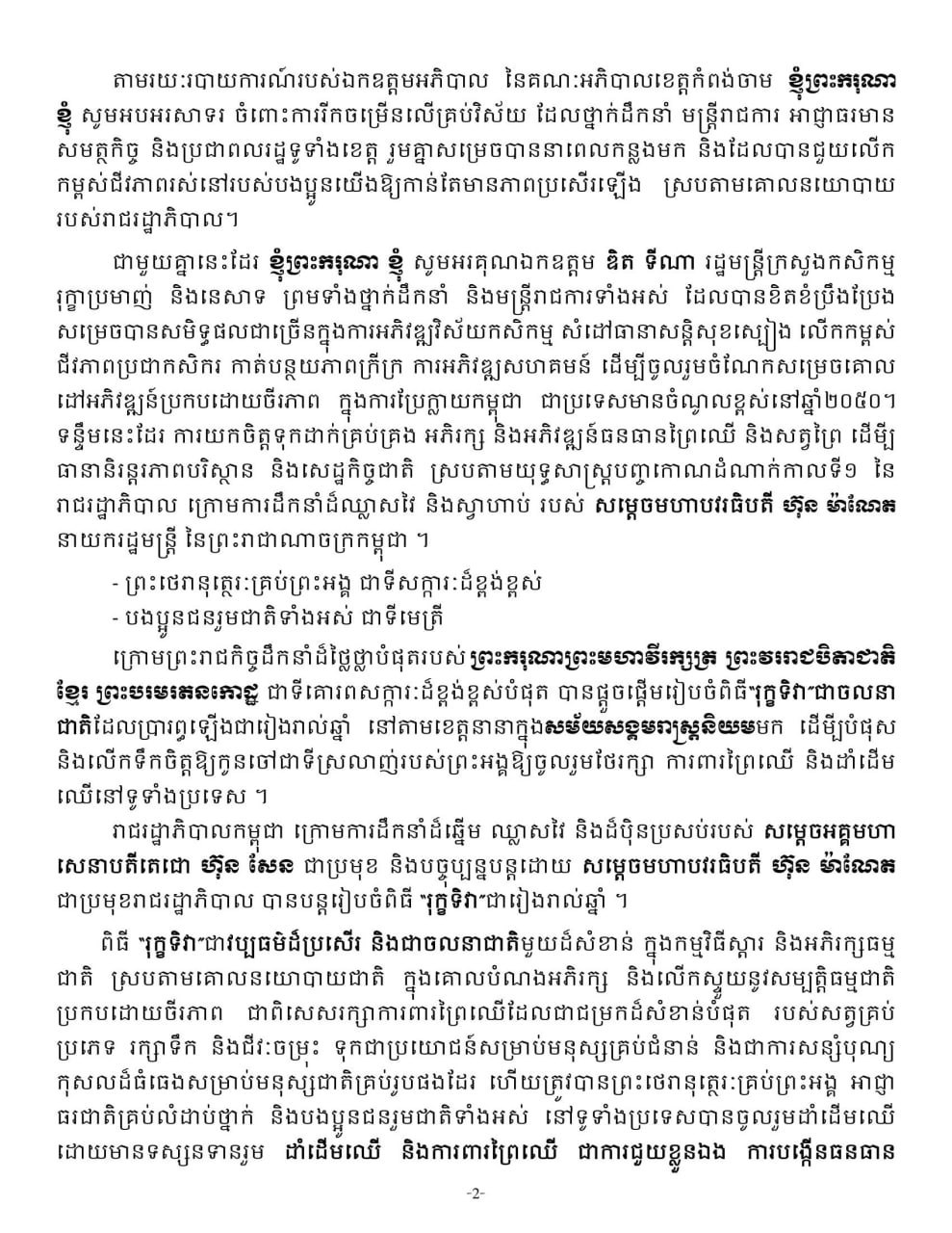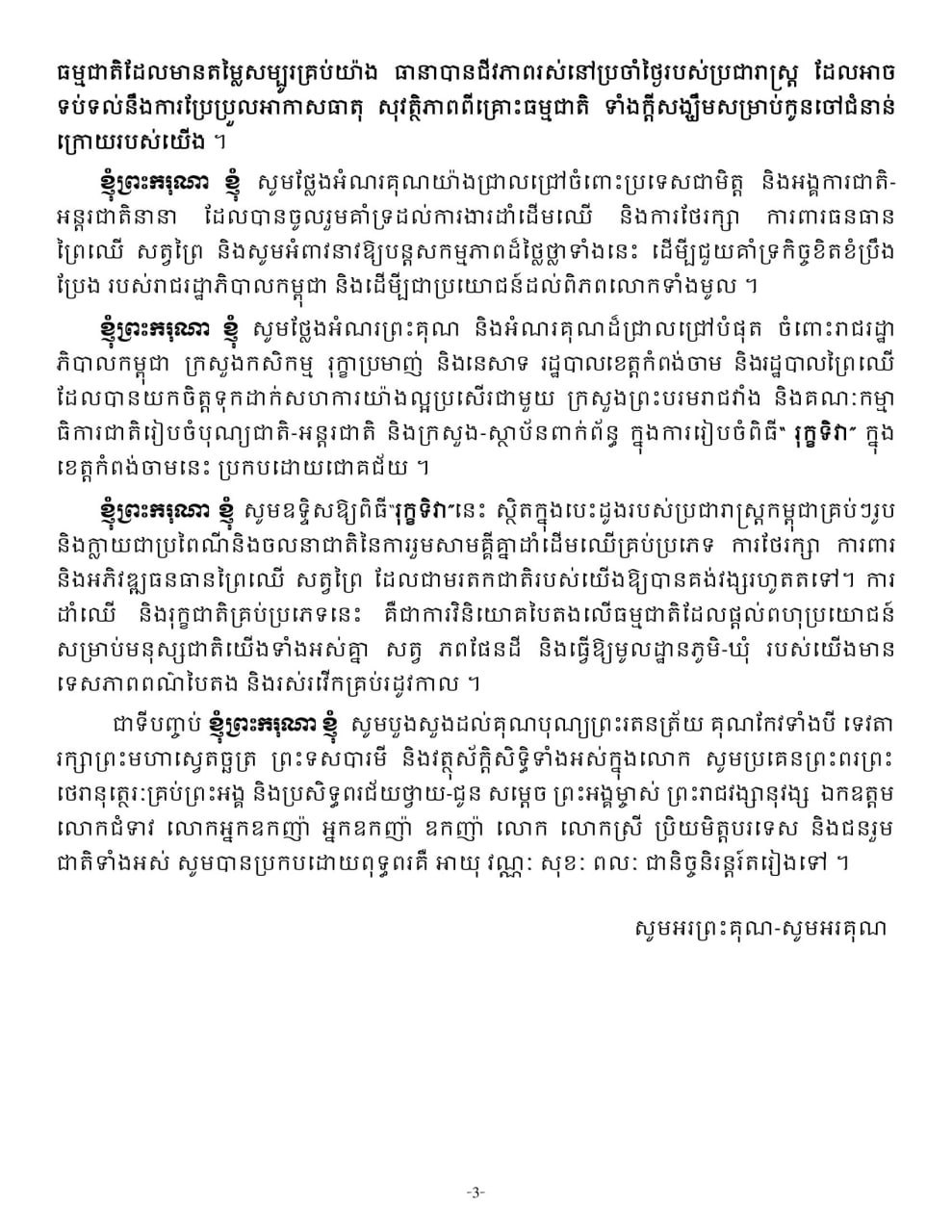 ព្រះរាជសុន្ទរកថាទាំងស្រុងរបស់ ព្រះករុណាព្រះបាទ សម្តេចព្រះបរមនាថ នរោត្តម សីហមុនី ព្រះមហាក្សត្រ នៃព្រះរាជាណាចក្រកម្ពុជា នៅក្នុងព្រះរាជពិធី «រុក្ខទិវា” នៅស្រុកចំការលើ ខេត្តកំពង់ចាម ថ្ងៃទី៩ ខែកក្កដា ឆ្នាំ២០២៥