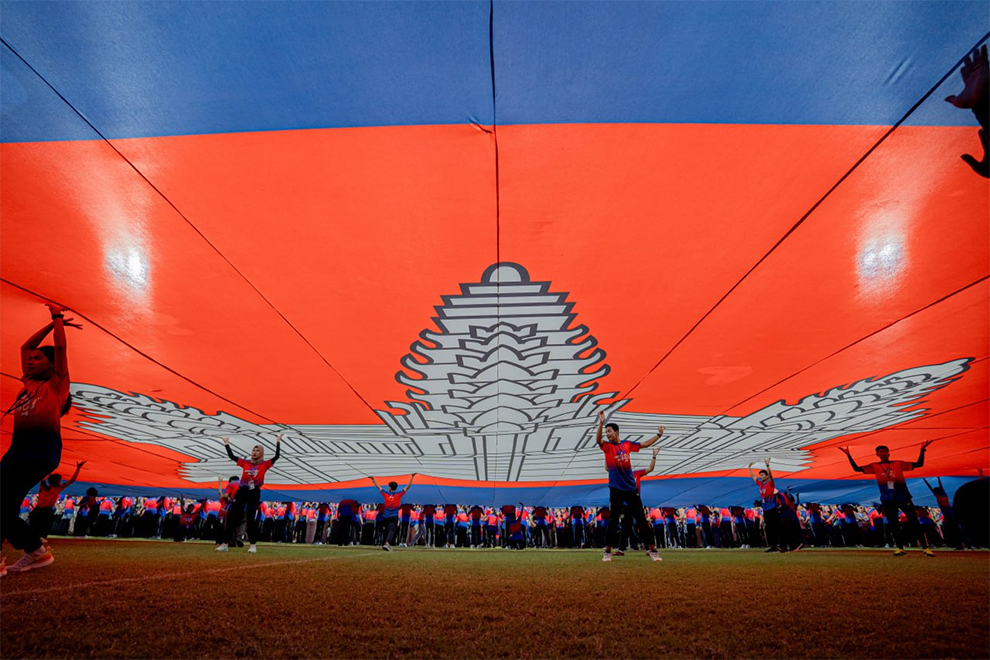 Performers hold a massive Cambodian flag aloft before a football solidarity match, held at the National Olympic Stadium on July 19. Supplied