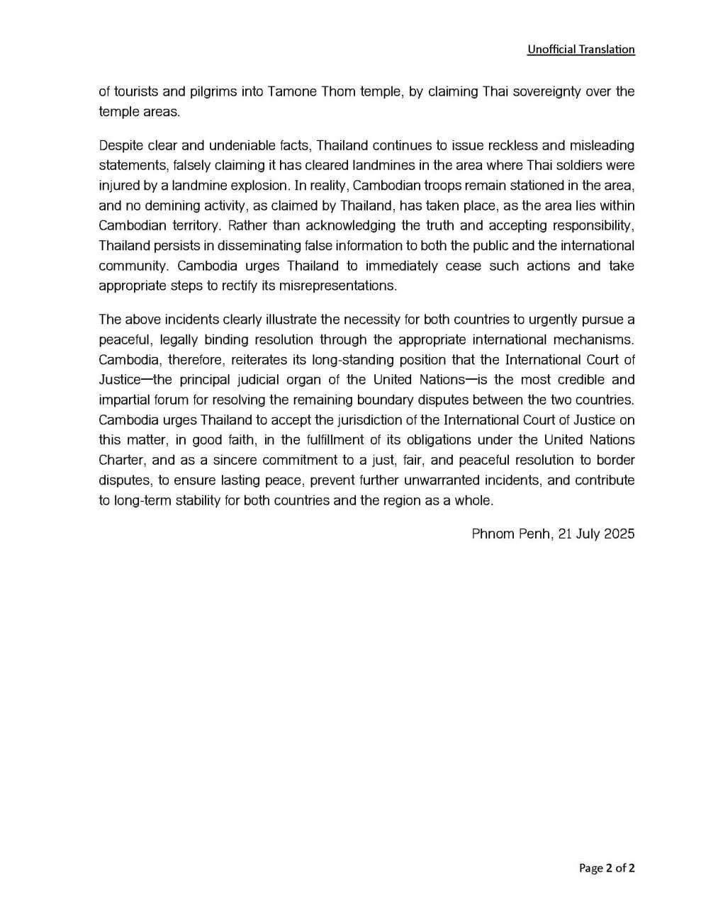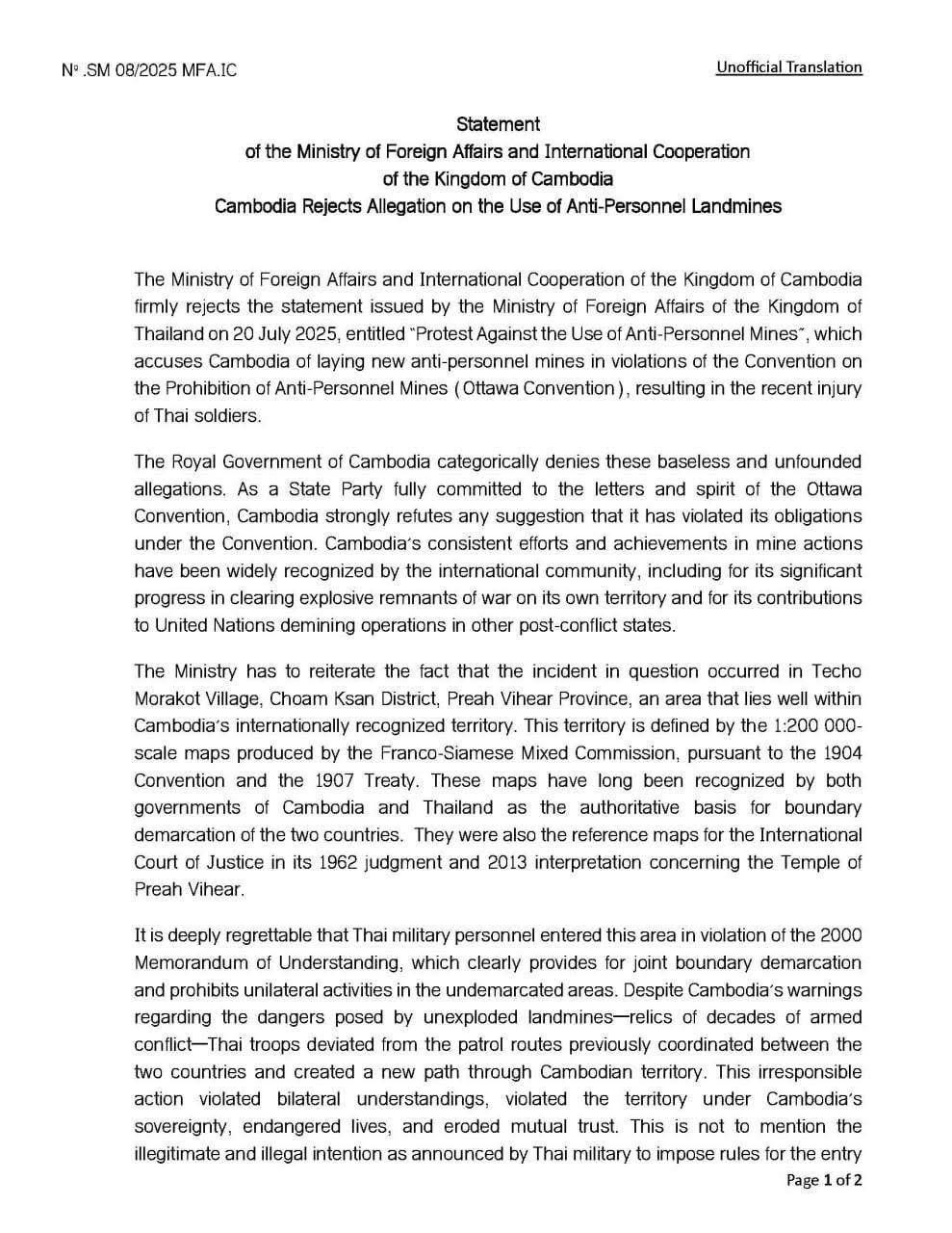 Statement of the Ministry of Foreign Affairs and International Cooperation of the Kingdom of Cambodia “Cambodia Rejects Allegation on the Use of Anti-Personnel Landmines”