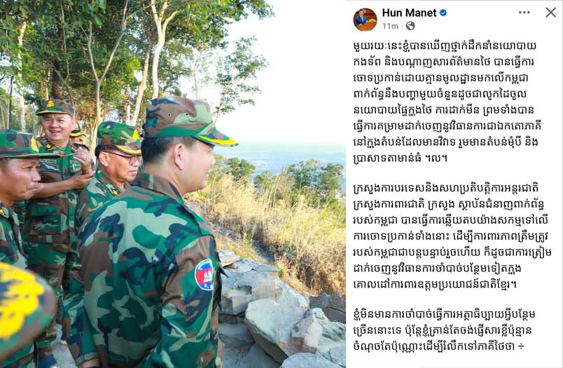 In a statement posted to his official social media accounts this morning, Samdech Thipadei expressed concern over repeated claims made by Thai political figures, military officials, and media outlets. These accusations target Cambodia on issues such as meddling in Thai domestic politics, deploying landmines, and threatening unilateral moves in contested areas like the Mom Bei area and Ta Mone Thom Temple.