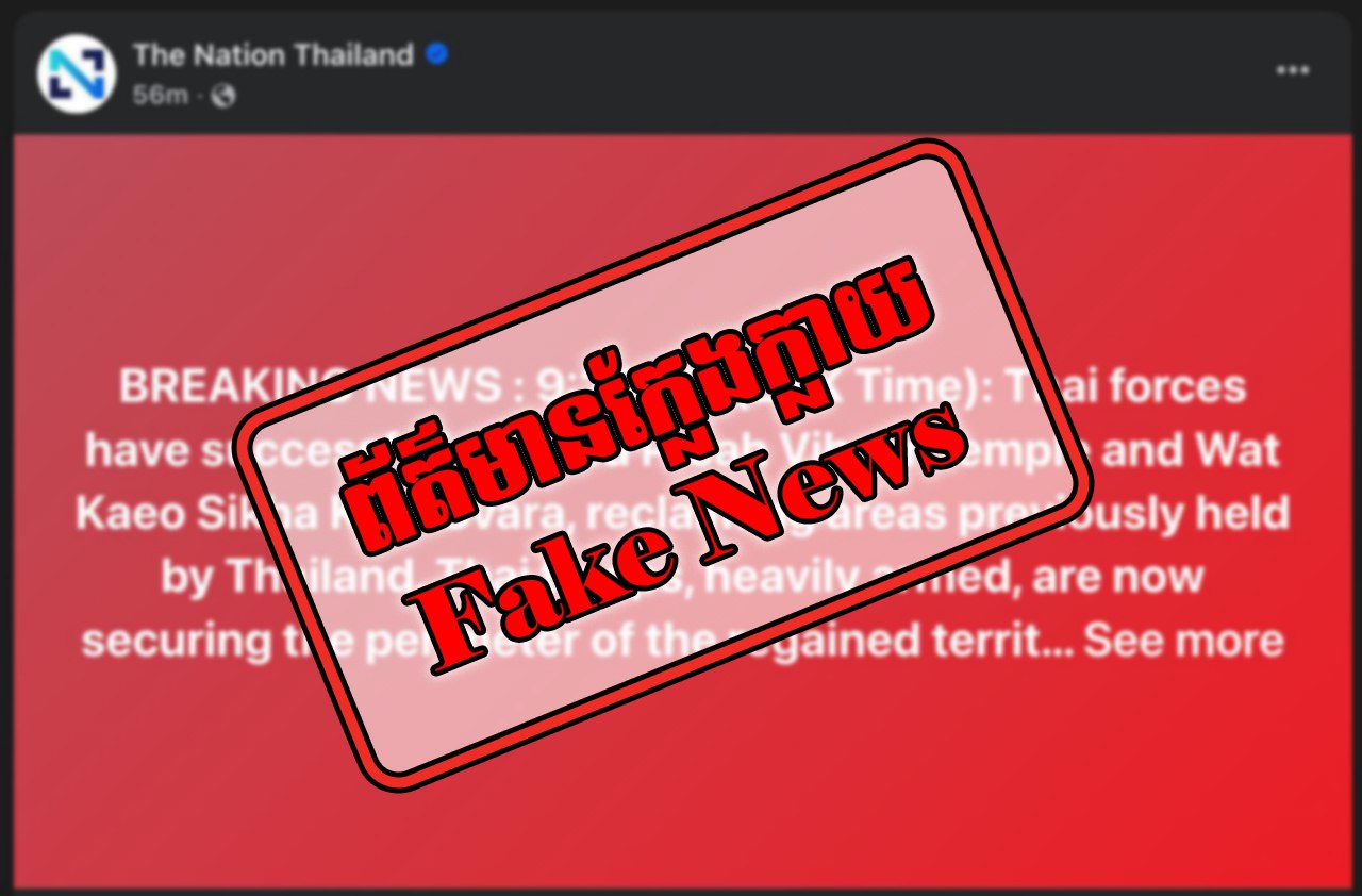 ថ្លែងនៅក្នុងសន្និសីទសារព័ត៌មាននៅទីស្តីការគណៈរដ្ឋមន្ត្រី ព្រឹកថ្ងៃទី២៥ ខែកក្កដា ឆ្នាំ២០២៥នេះ លោកជំទាវ ឧត្តមសេនីយ៍ឯក ម៉ាលី សុជាតា អ្នកនាំពាក្យក្រសួងការពារជាតិ បានច្រានចោលការចុះផ្សាយព័ត៌មានប្រឌិត របស់សារពត៌មានថៃ The Nation ដែលផ្សាយថា នៅម៉ោង ៩:២៥ នាទីព្រឹក ម៉ោងនៅទីក្រុងបាងកក យោធាថៃបានកាន់កាប់ប្រាសាទព្រះវិហាររបស់ខ្មែរទាំងស្រុង រួមទាំងវត្តកែវសិក្ខាគិរីស្វារៈ និងតំបន់នៅជុំវិញនោះ គឺជាព័ត៌មានប្រឌិត និងបំភ្លៃការពិតតែប៉ុណ្ណោះ។