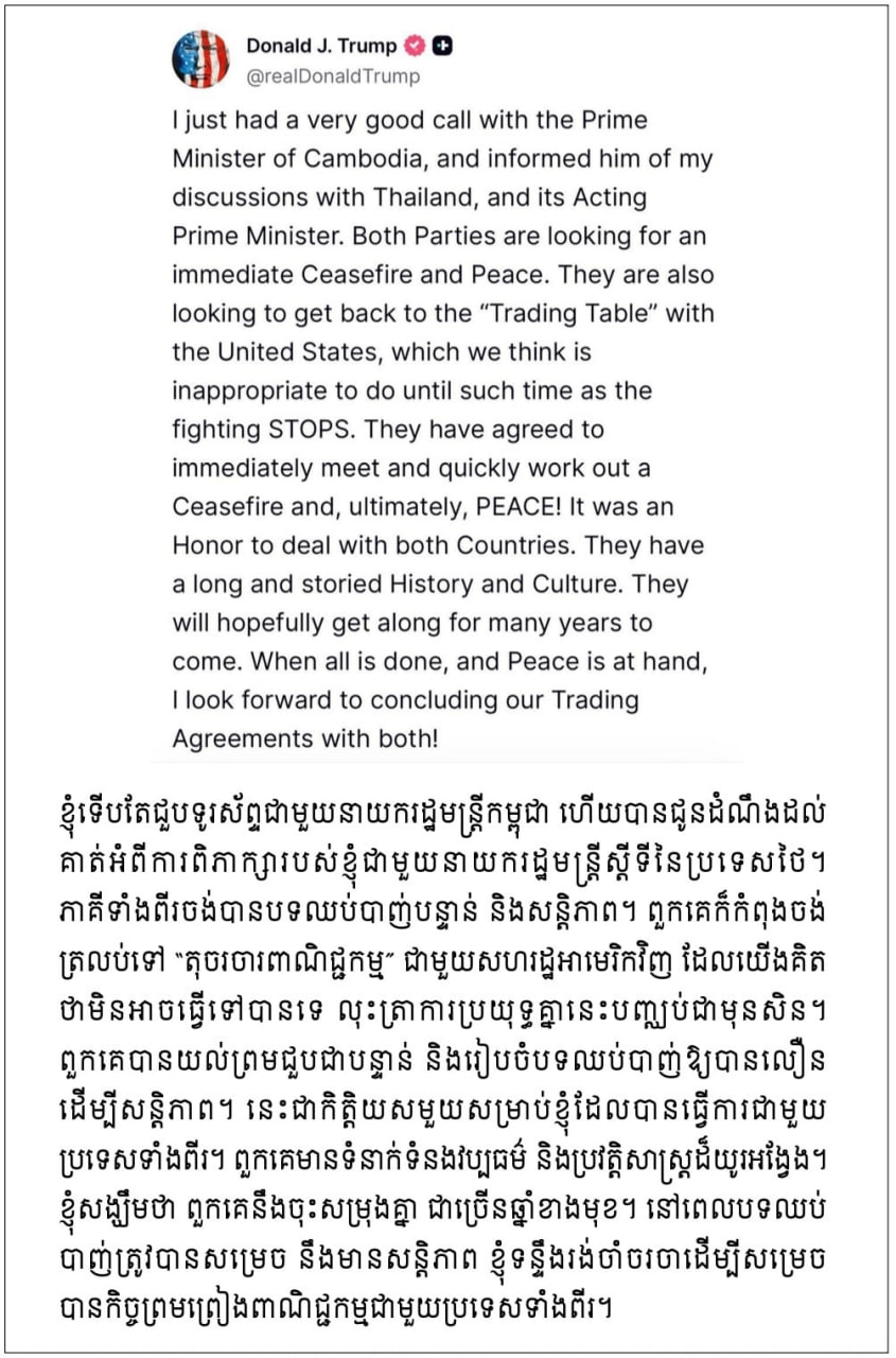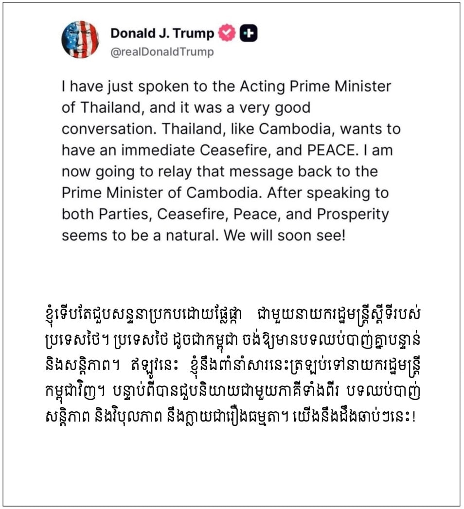 ជាដំណឹងល្អដែលខ្ញុំបានទទួលពីឯកឧត្តម Donald Trump ក្រោយពីឯកឧត្តមបានពិភាក្សាជាមួយឯកឧត្តម Phumtham Wechayachai នាយករដ្ឋមន្ត្រីស្តីទីថៃ គឺភាគីថៃបានឯកភាពជាមួយសំណើរបស់ឯកឧត្តមប្រធានាធិបតី ស្តីពីការឈប់បាញ់គ្នាភ្លាមផងដែរ។ នេះគឺជាដំណឹងដ៏ល្អសម្រាប់កងទ័ព និងប្រជាជននៃប្រទេសទាំងពីរ។