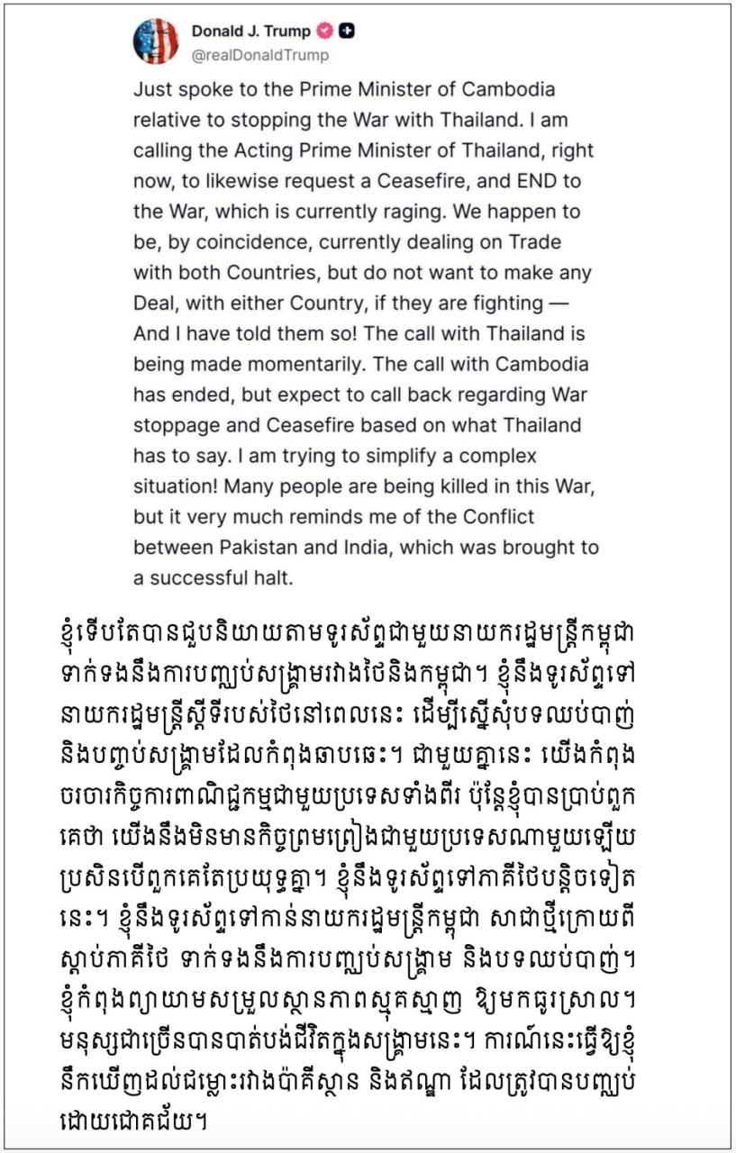 After he had spoken with His Excellency Phumtham Wechayachai, the acting Prime Minister of Thailand, Honorable President Donald Trump conveyed to me a positive piece of news that the Thai side also agreed to Honorable President’s proposal for an immediate ceasefire. This is really great news for the soldiers and people of both countries.