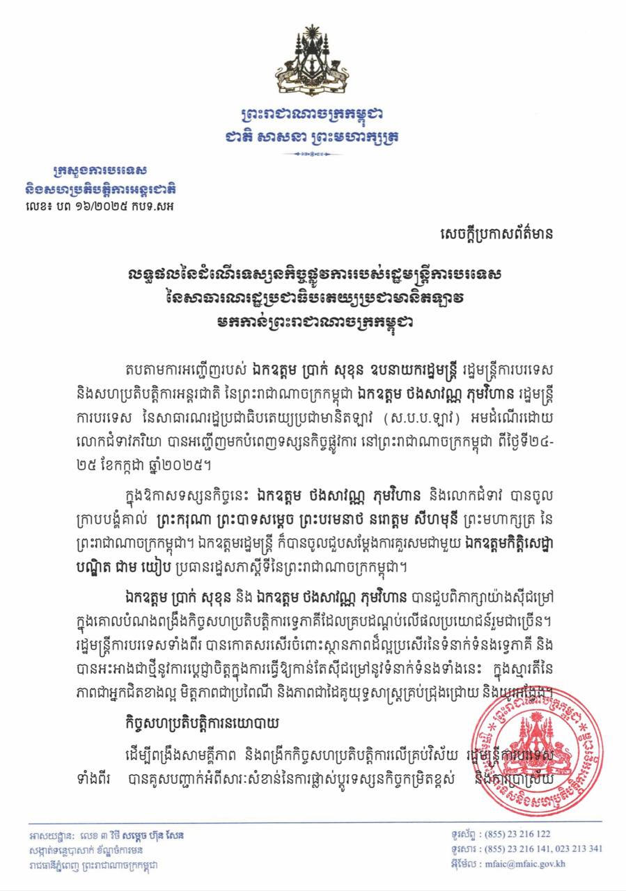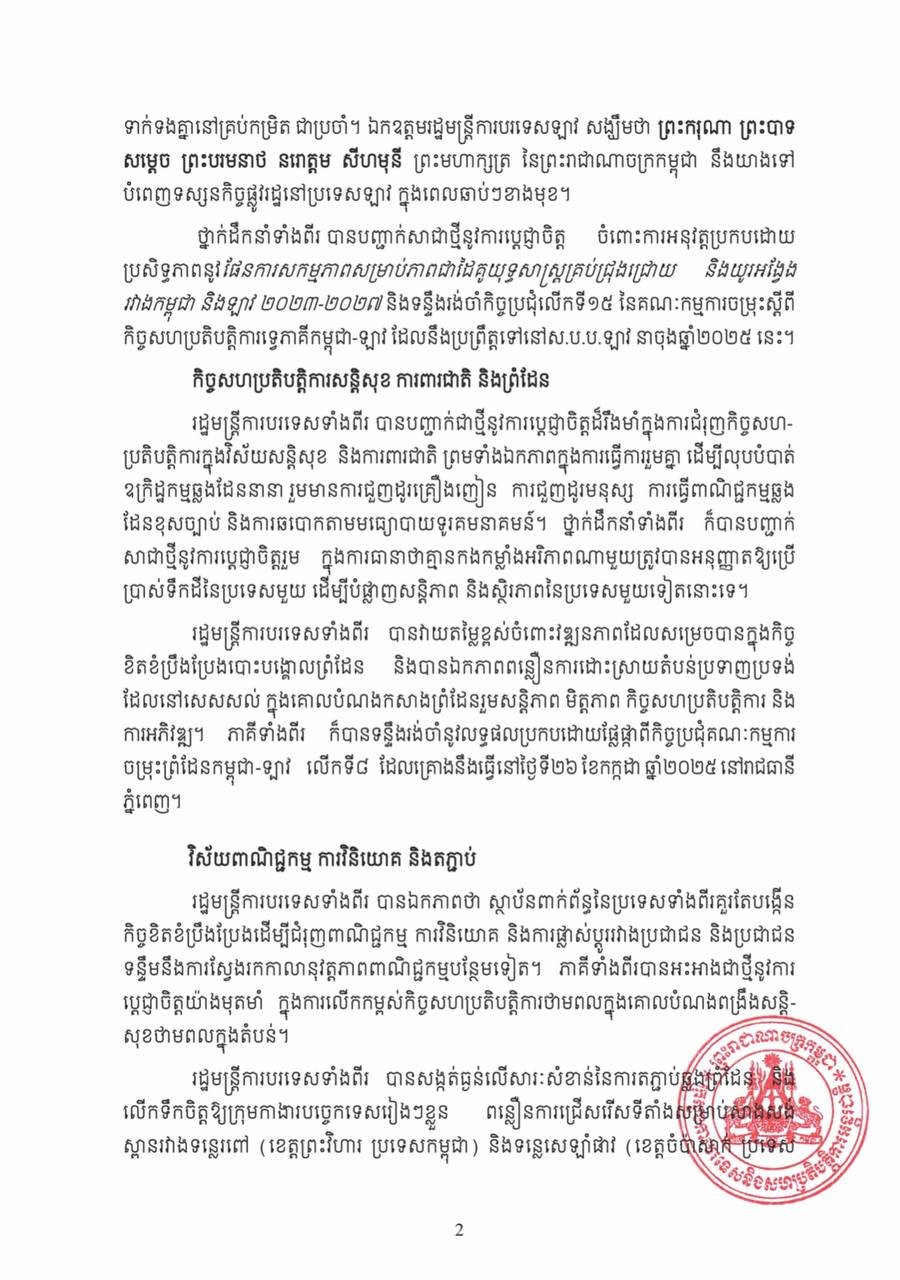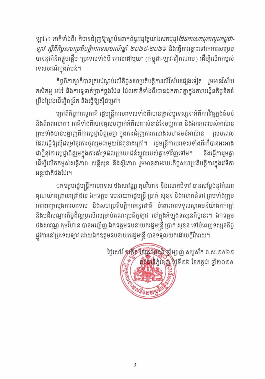 លទ្ធផលនៃដំណើរទស្សនកិច្ចផ្លូវការរបស់រដ្ឋមន្រ្តីការបរទេស នៃសាធារណរដ្ឋប្រជាធិបតេយ្យប្រជាមានិតឡាវ មកកាន់ព្រះរាជាណាចក្រកម្ពុជា