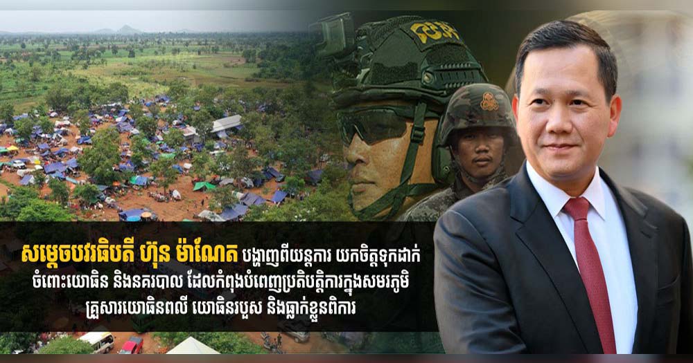 សម្តេចបវរធិបតី ហ៊ុន ម៉ាណែត បង្ហាញពីយន្តការយកចិត្តទុកដាក់ ចំពោះយោធិន និងនគរបាល ដែលកំពុងបំពេញប្រតិបត្តិការក្នុងសមរភូមិ គ្រួសារយោធិនពលី យោធិនរបួស និងធ្លាក់ខ្លួនពិការ