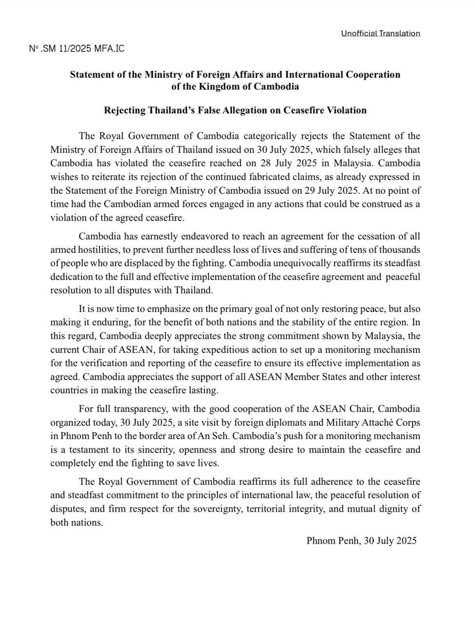 Statement of the Ministry of Foreign Affairs and International Cooperation of the Kingdom of Cambodia, Rejecting Thailand’s False Allegation on Ceasefire Violation