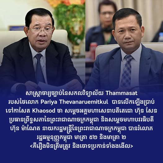 សាស្រ្តាចារ្យច្បាប់នៃសកលវិទ្យាល័យ Thammasat របស់ថៃលោក Pariya Thevanaruemitkul បានលើកឡើងប្រាប់ទៅកាសែត Khaosod ថា សម្តេចអគ្គមហាសេនាបតីតេជោ ហ៊ុន សែន ប្រធានព្រឹទ្ធសភានៃព្រះរាជាណាចក្រកម្ពុជា និង សម្តេចមហាបវរធិបតី ហ៊ុន ម៉ាណែត នាយករដ្ឋមន្រ្តីនៃព្រះរាជាណាចក្រកម្ពុជា បានរំលោភរដ្ឋធម្មនុញ្ញកម្ពុជាមាត្រា ៥២ និងមាត្រា ២ គឺរឿងមិនត្រឹមត្រូវ និងចោទប្រកាន់ទាំងងងើល ពីព្រោះ ៖