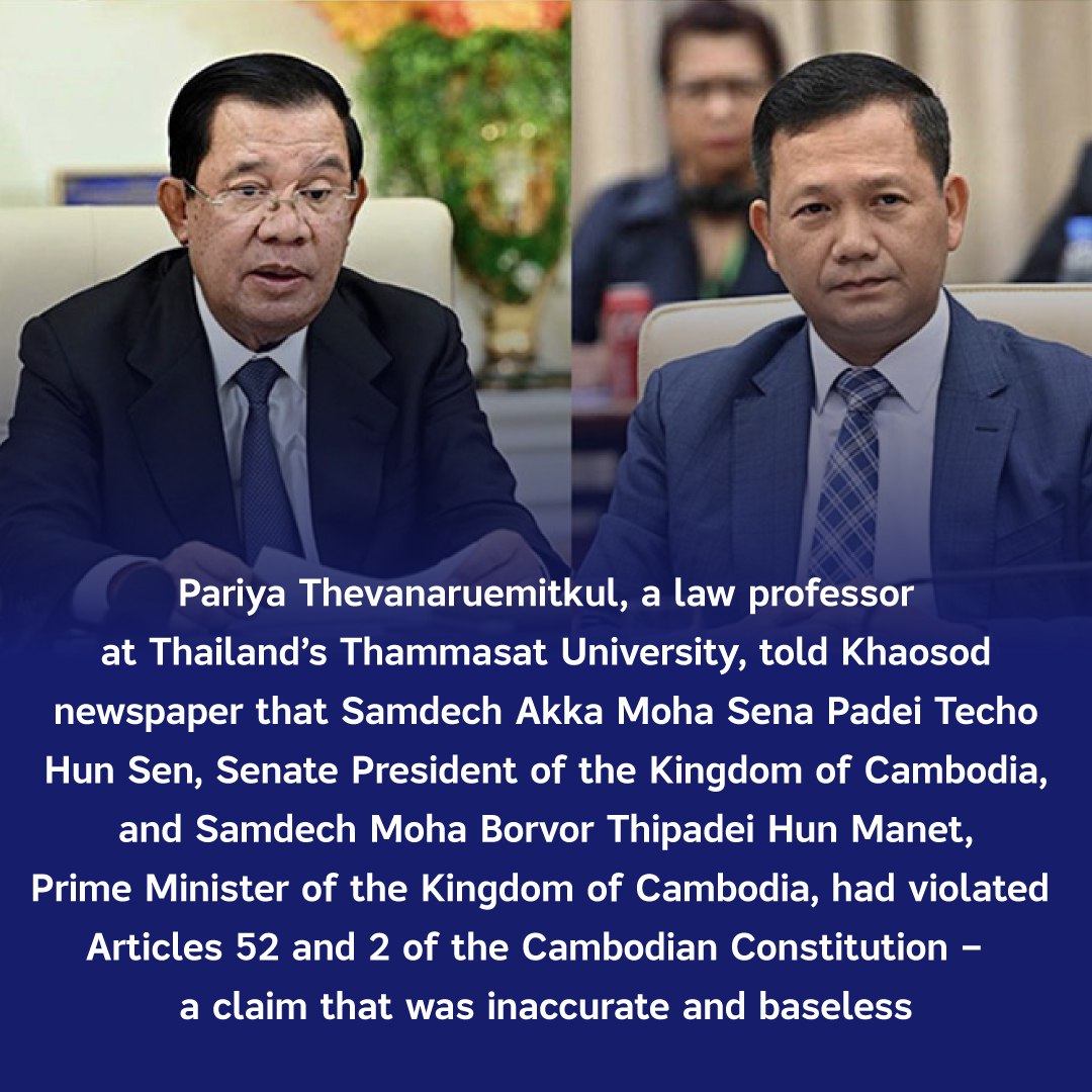 Pariya Thevanaruemitkul, a law professor at Thailand’s Thammasat University, told Khaosod newspaper that Samdech Akka Moha Sena Padei Techo Hun Sen, Senate President of the Kingdom of Cambodia, and Samdech Moha Borvor Thipadei Hun Manet, Prime Minister of the Kingdom of Cambodia, had violated Articles 52 and 2 of the Cambodian Constitution — a claim that was inaccurate and baseless, because: