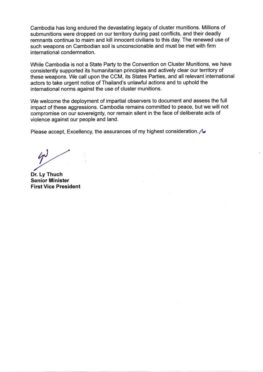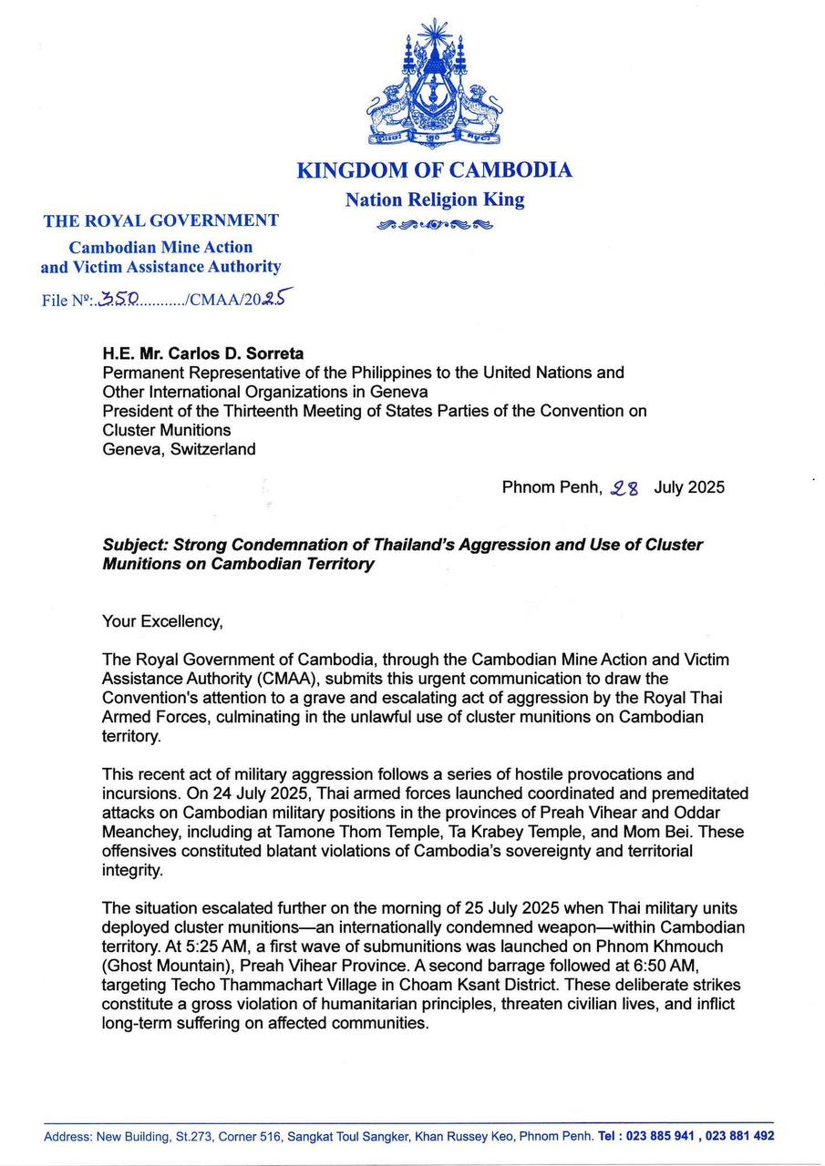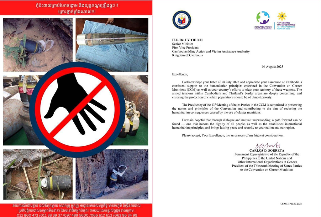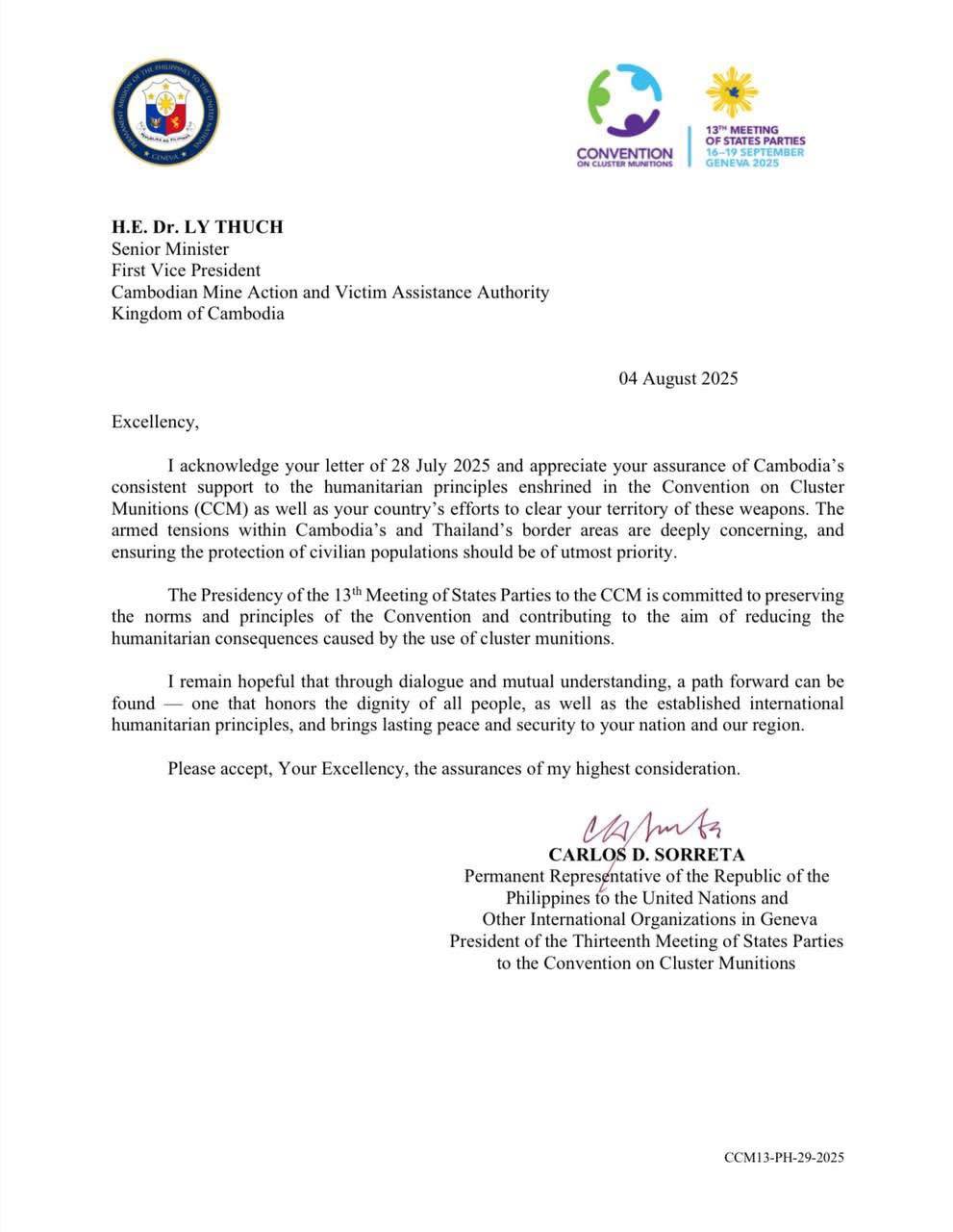 ឯកឧត្តម CARLOS D. SORRETA ប្រធានកិច្ចប្រជុំរដ្ឋភាគីលើកទី១៣ នៃអនុសញ្ញាស្តីពីគ្រាប់បែកចង្កោម បានទទួលលិខិតផ្លូវការរបស់កម្ពុជាចុះថ្ងៃទី២៨ ខែកក្កដា ឆ្នាំ២០២៥ ស្តីពីការថ្កោលទោសចំពោះការប្រើប្រាស់គ្រាប់បែកចង្កោមដោយយោធាថៃនៅតាមបណ្តោយព្រំដែនកម្ពុជា។