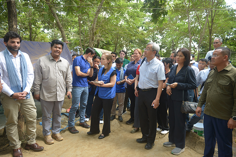 The visit was led by Secretaries of State Kan Pharidh and Un Kheang from the Ministry of Foreign Affairs and International Cooperation, who guided the delegation during an on-site inspection of the temporary shelter at Wat Thmor Kambor in Pou Chas village.
