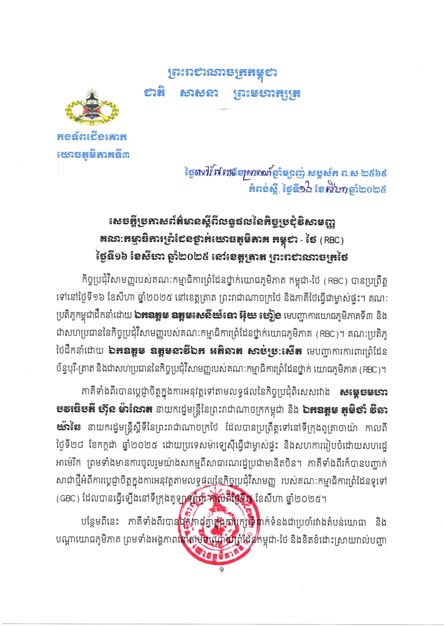 (ភ្នំពេញ)៖ កងទ័ពជើងគោក បានចេញសេចក្តីប្រកាសព័ត៌មាន ស្តីពីលទ្ធផលនៃកិច្ចប្រជុំវិសាមញ្ញនៃគណៈកម្មាធិការកិច្ចការព្រំដែនថ្នាក់យោធភូមិភាគកម្ពុជា-ថៃ (RBC) លើកទី២៧ រវាងយោធភូមិភាគីទី៣ នៃកងយោធពលខេមរភូមិន្ទ និងបញ្ជាការដ្ឋានការពារព្រំដែនច័ន្ទបុរី-ត្រាត នៅថ្ងៃទី១៦ ខែសីហា ឆ្នាំ២០២៥ នៅខេត្តត្រាត ព្រះរាជាណាចក្រថៃ។