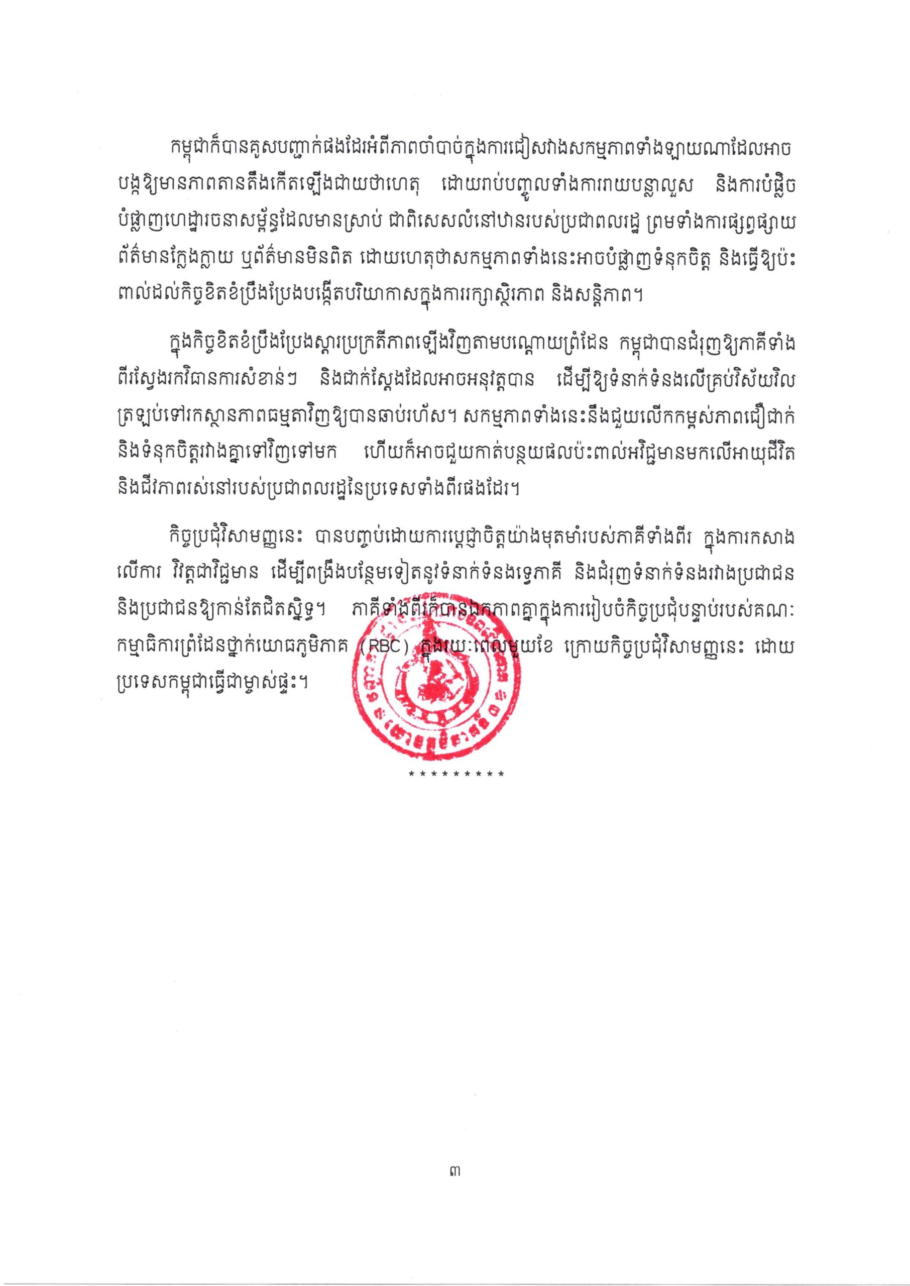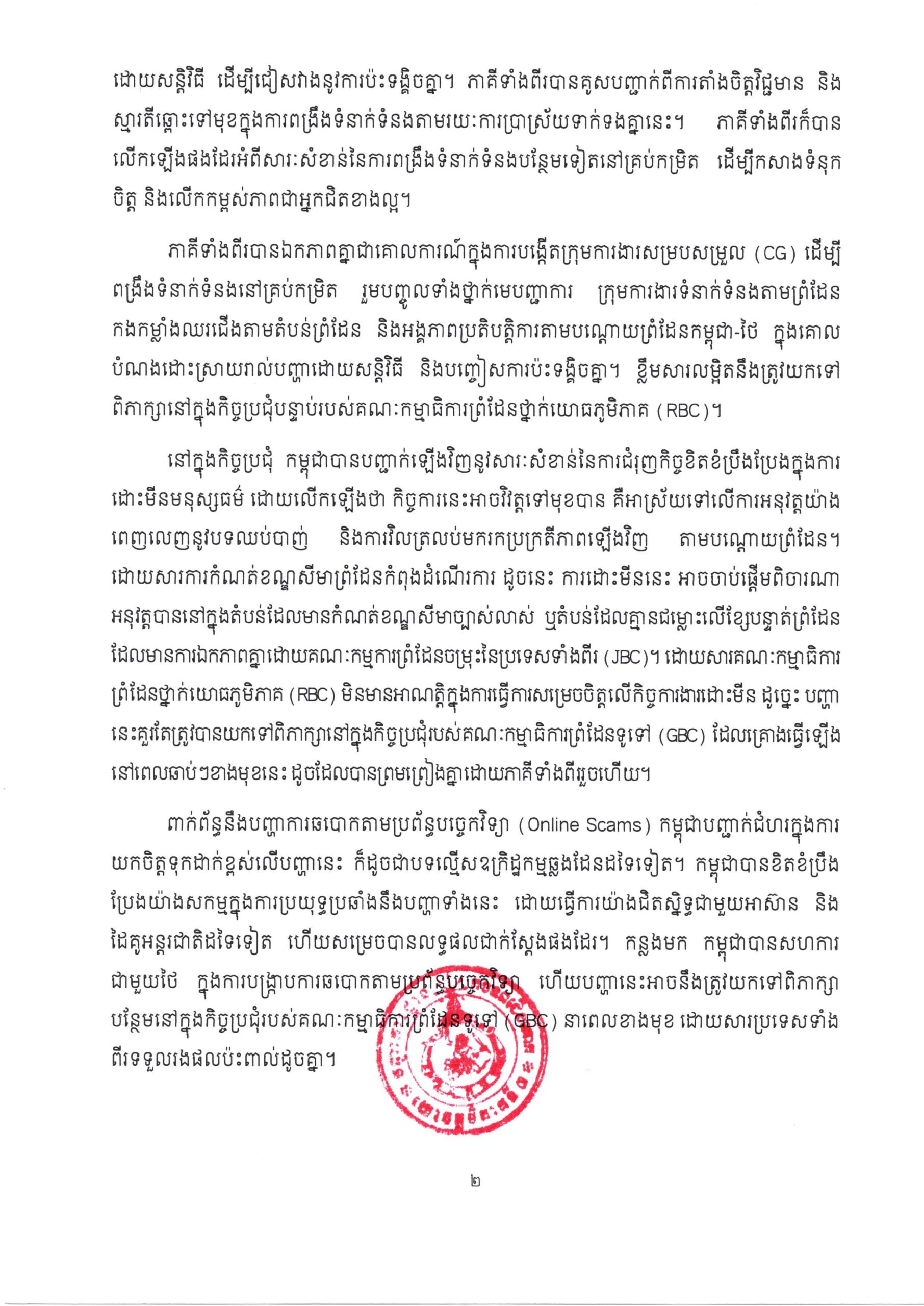 កងទ័ពជើងគោក ប្រកាសព័ត៌មានពីលទ្ធផលនៃកិច្ចប្រជុំវិសាមញ្ញនៃគណៈកម្មាធិការកិច្ចការព្រំដែន ថ្នាក់យោធភូមិភាគកម្ពុជា-ថៃ (RBC) លើកទី២៧ រវាងយោធភូមិភាគីទី៣ នៃកងយោធពលខេមរភូមិន្ទ និងបញ្ជាការដ្ឋានការពារព្រំដែនច័ន្ទបុរី-ត្រាត