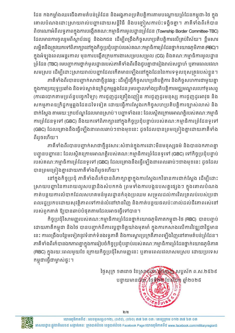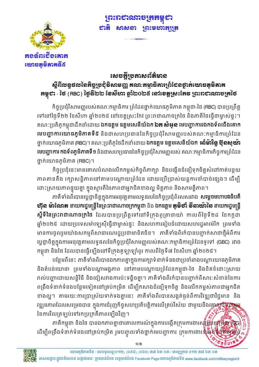 សេចក្តីប្រកាសព័ត៌មានស្តីពី លទ្ធផលនៃកិច្ចប្រជុំវិសាមញ្ញរបស់គណៈកម្មាធិការព្រំដែនថ្នាក់យោធភូមិភាគ កម្ពុជា-ថៃ (RBC) រវាងយោធភូមិភាគទី៥ របស់កម្ពុជា និងកងទ័ពភូមិភាគទី១ របស់ថៃ នៅថ្ងៃទី២២ ខែសីហា ឆ្នាំ២០២៥ នៅខេត្តស្រះកែវ ព្រះរាជាណាចក្រថៃ