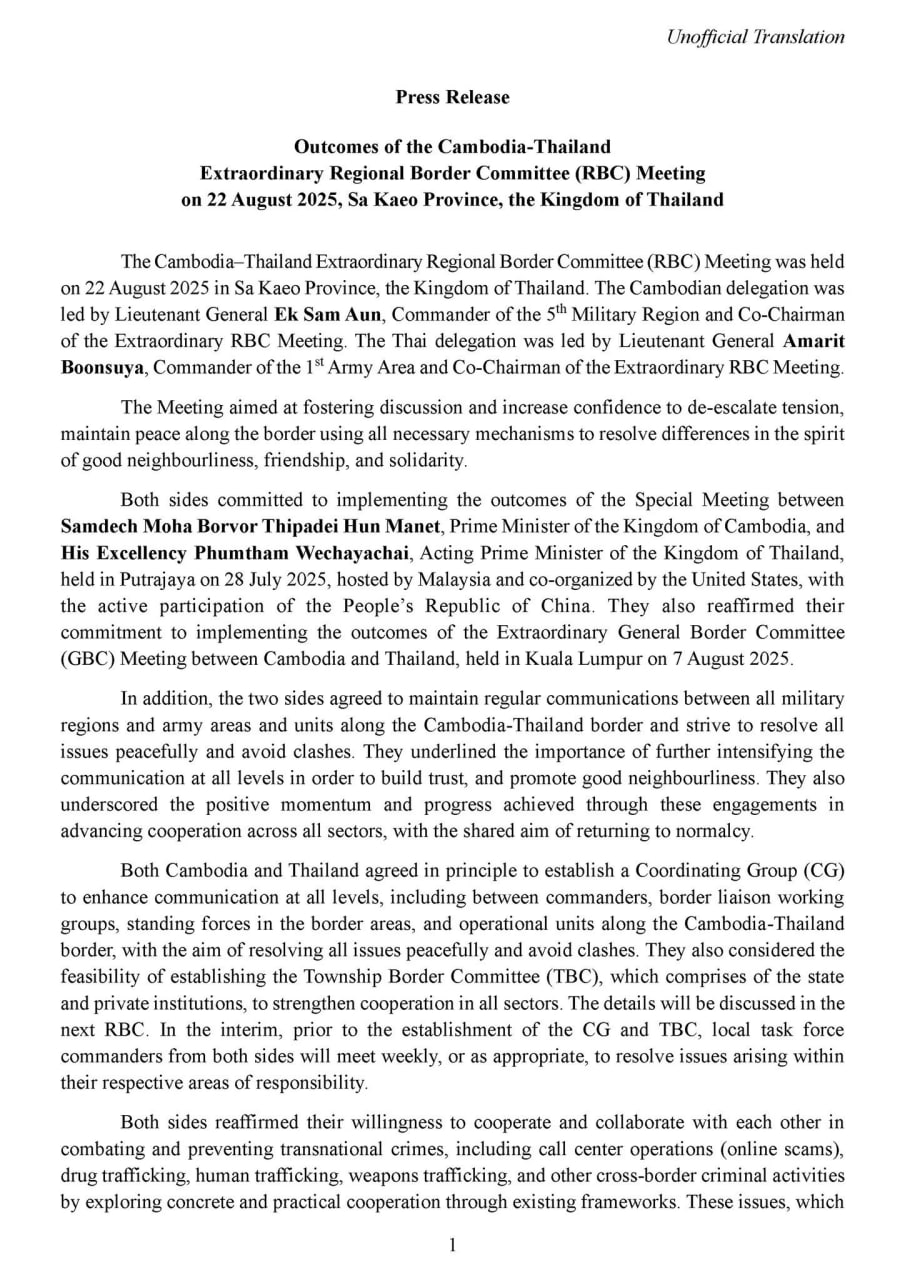 Press Release on the Outcomes of the Extraordinary Meeting of the Cambodia-Thailand Regional Border Committee (RBC) between the 5th Military Region of Cambodia and the 1st Army Area of Thailand, held on 22 August 2025 in Sa Kaeo Province, the Kingdom of Thailand.
