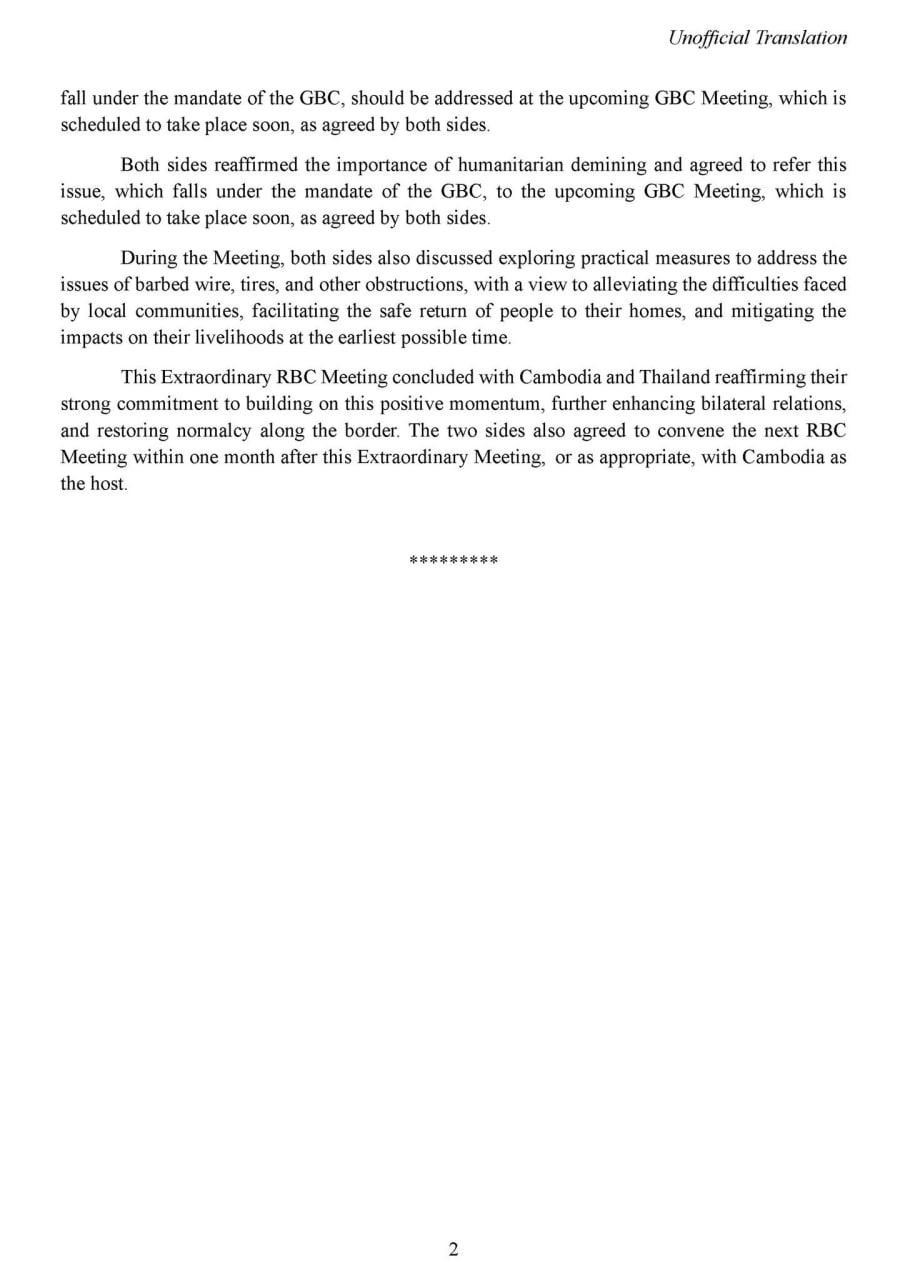 សេចក្តីប្រកាសព័ត៌មានស្តីពី លទ្ធផលនៃកិច្ចប្រជុំវិសាមញ្ញរបស់គណៈកម្មាធិការព្រំដែនថ្នាក់យោធភូមិភាគ កម្ពុជា-ថៃ  (RBC) រវាងយោធភូមិភាគទី៥ របស់កម្ពុជា និងកងទ័ពភូមិភាគទី១ របស់ថៃ នៅថ្ងៃទី២២ ខែសីហា ឆ្នាំ២០២៥ នៅខេត្តស្រះកែវ ព្រះរាជាណាចក្រថៃ សេចក្តីប្រកាសព័ត៌មានស្តីពី លទ្ធផលនៃកិច្ចប្រជុំវិសាមញ្ញរបស់គណៈកម្មាធិការព្រំដែនថ្នាក់យោធភូមិភាគ កម្ពុជា-ថៃ (RBC) រវាងយោធភូមិភាគទី៥ របស់កម្ពុជា និងកងទ័ពភូមិភាគទី១ របស់ថៃ នៅថ្ងៃទី២២ ខែសីហា ឆ្នាំ២០២៥ នៅខេត្តស្រះកែវ ព្រះរាជាណាចក្រថៃ