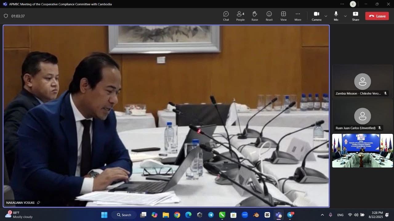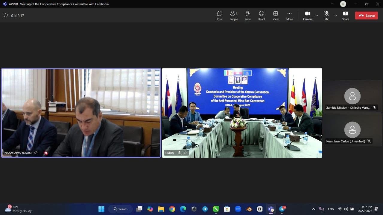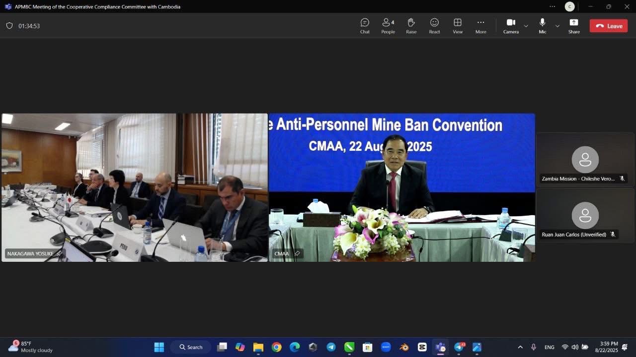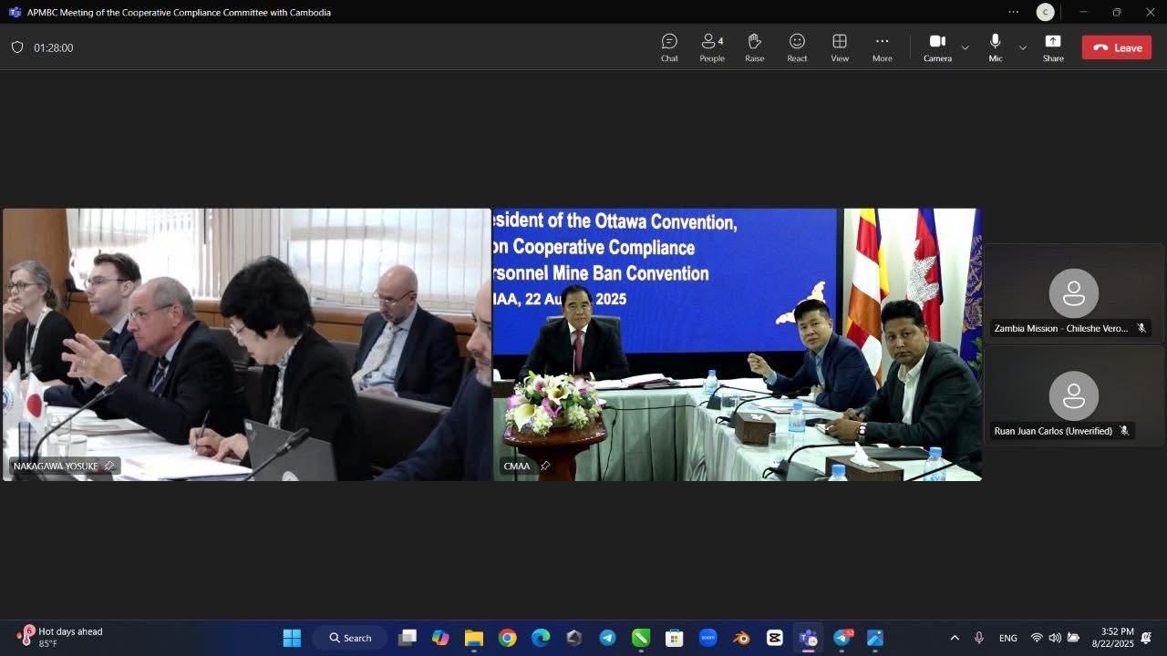 ថ្ងៃទី២២ ខែសីហា ឆ្នាំ២០២៥ នៅទីស្នាក់ការអាជ្ញាធរមីន ឯកឧត្តមបណ្ឌិត លី ធុជ ទេសរដ្ឋមន្ត្រី អនុប្រធានទី១ អាជ្ញាធរមីន បានជួបប្រជុំតាមរយៈប្រព័ន្ធអនឡាញ ជាមួយលោកជំទាវ Ichikawa Tomiko ប្រធានអនុសញ្ញាស្តីពីហាមប្រាមការប្រើប្រាស់មីនប្រឆាំងមនុស្ស(អនុសញ្ញាអូតាវ៉ា) និងគណៈកម្មការអនុលោមភាពនៃអនុសញ្ញាអូតាវ៉ា (Cooperative Compliance Committee) ដើម្បីស្រាយបំភ្លឺទៅលើការចោទប្រកាន់របស់ថៃដែលថាកម្ពុជាបានដាក់មីនថ្មី និងបង្ហាញពីជំហររបស់កម្ពុជា ក្នុងនាមជារដ្ឋភាគីអនុសញ្ញាអូតាវ៉ា។ កិច្ចប្រជុំនេះផងដែរ ក៏មានវត្តមានចូលរួមរបស់ ឯកឧត្តម ឯកអគ្គរាជទូត អ៊ិន តារា តំណាងអចិន្ត្រៃយ៍កម្ពុជាប្រចាំអង្គការសហប្រជាជាតិនៅទីក្រុងហ្សឺណែវ។