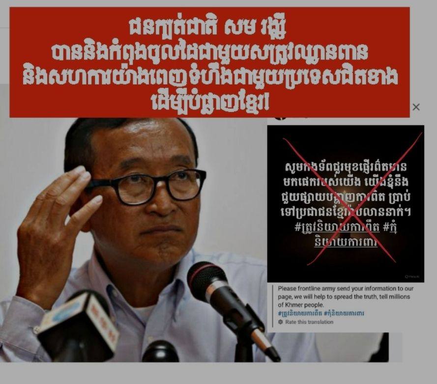 ថ្ងៃនេះ ខ្ញុំបានឃើញសារបង្ហោះរបស់ទណ្ឌិតក្បត់ជាតិ សម រង្ស៊ី ដែលបំផុសឱ្យកងទ័ពជួរមុខផ្ញើព័ត៌មានទៅកាន់ផេករបស់ខ្លួន ដើម្បីជនក្បត់ជាតិរូបនេះយកទៅបង្ហោះផ្សព្វផ្សាយ និងអួតខ្លួនឯងដូចជាអ្នកស្រឡាញ់ជាតិខ្លាំងណាស់ ក្រោមលេសដែលជននេះនិយាយថា ដើម្បីបង្ហាញការពិត។