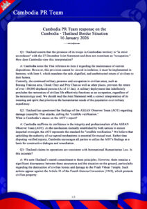 – The Ministry of Foreign Affairs and International Cooperationunderlines again that Cambodia remains deeply committed to the ceasefire agreement and the spirit of good neighborliness, consistently pursuing peaceful means to address border issues through bilateral mechanisms and ASEAN frameworks.