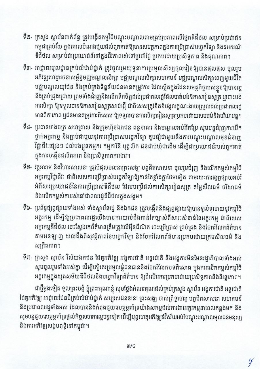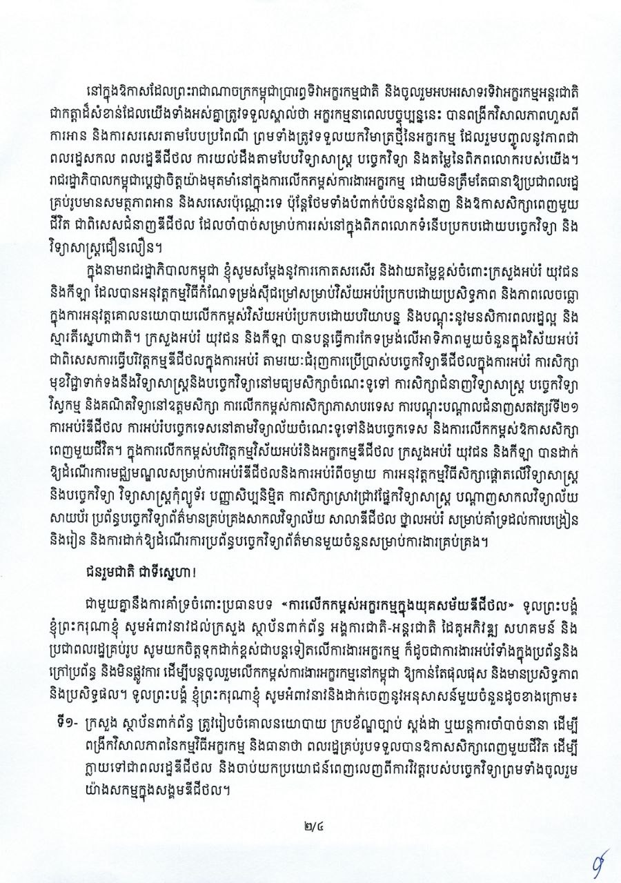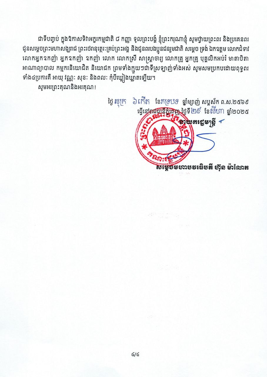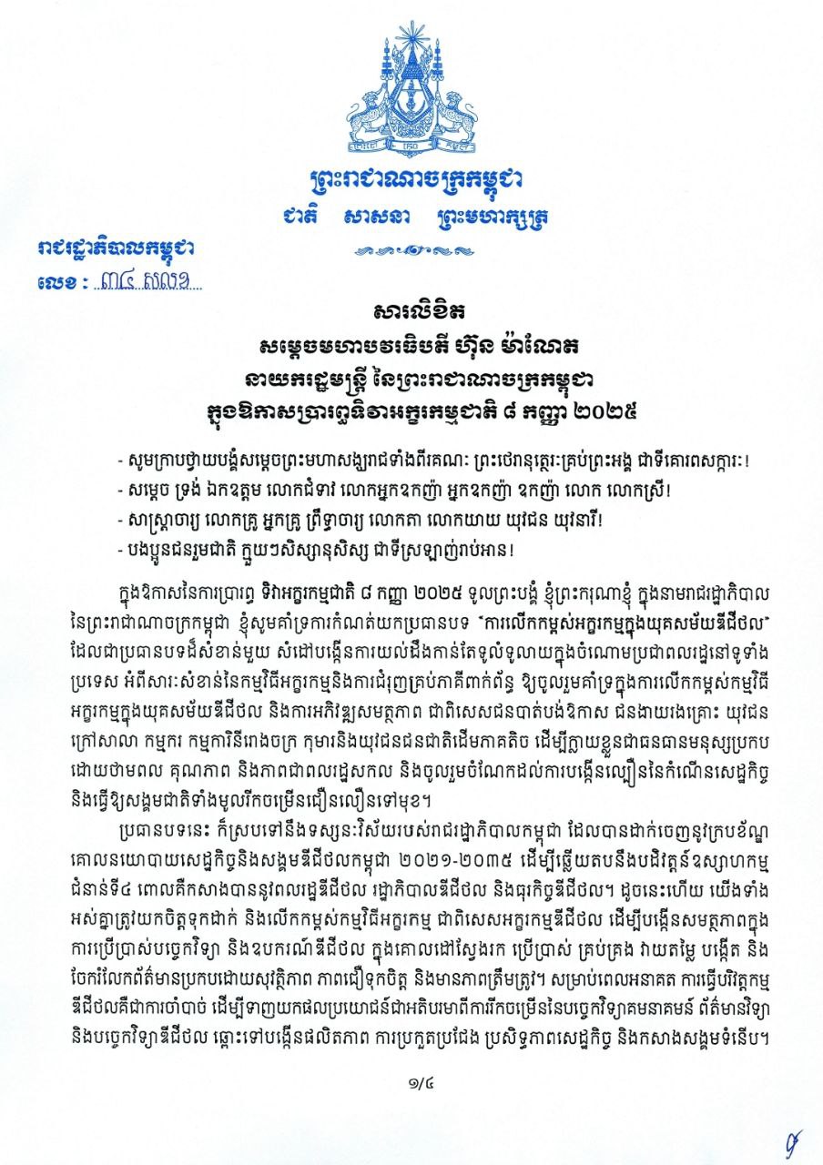 សារលិខិត សម្តេចមហាបវរធិបតី ហ៊ុន ម៉ាណែត នាយករដ្ឋមន្ត្រី នៃព្រះរាជាណាចក្រកម្ពុជា ក្នុងឱកាសប្រារព្ធទិវាអក្ខរកម្មជាតិ ៨ កញ្ញា ២០២៥
