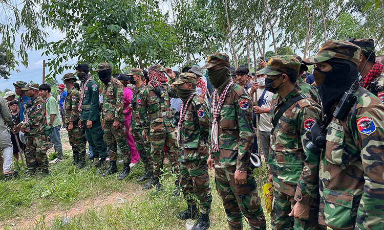Unarmed Cambodian soldiers stand by to protect villagers from the Thai army in the border village of Chok Chey in Banteay Meanchey province yesterday. RCA