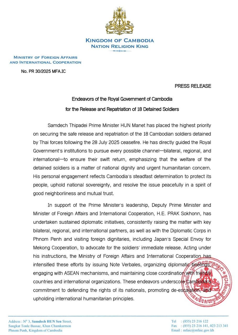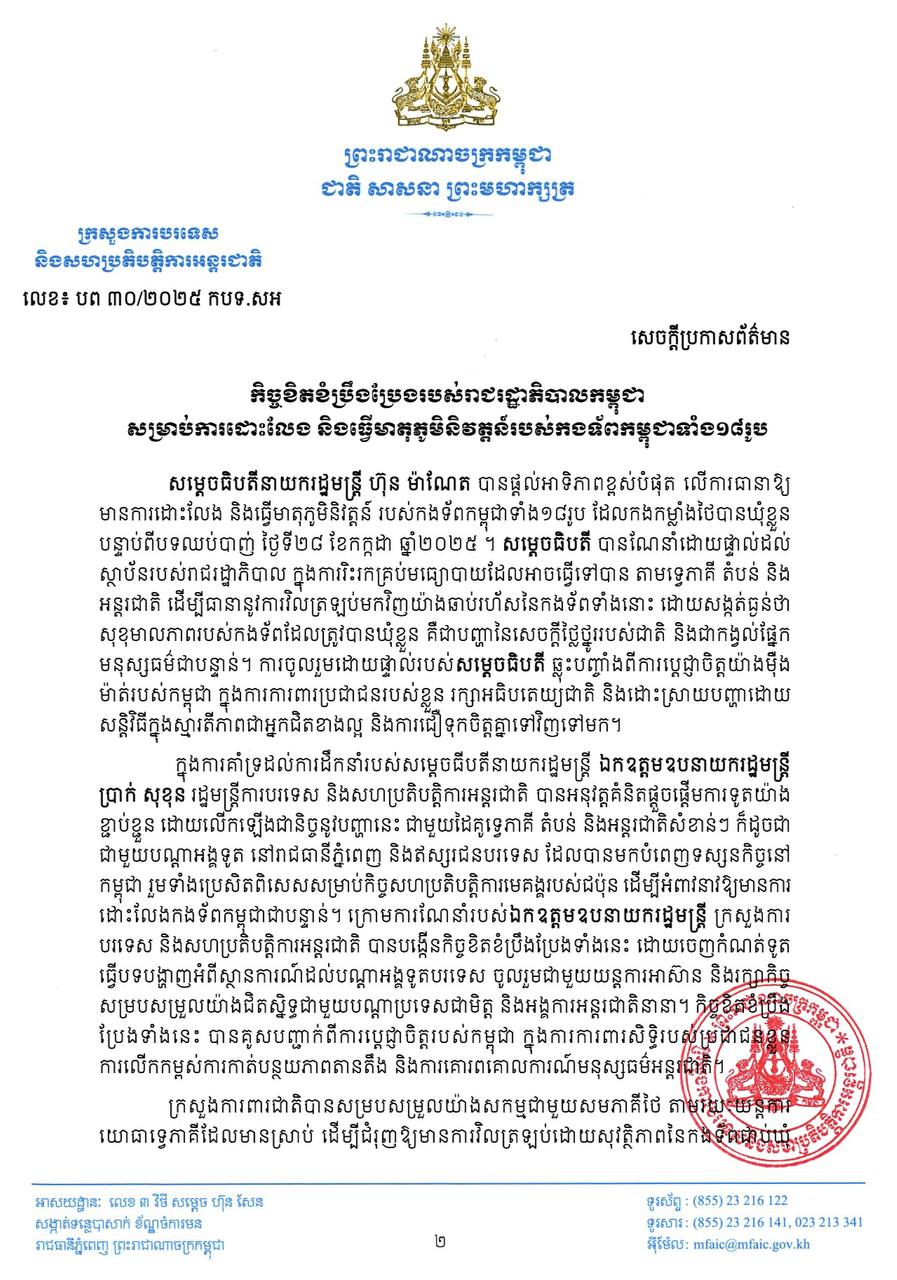 សេចក្តីប្រកាសព័ត៌មានរបស់ក្រសួងការបរទេស បានគូសបញ្ជាក់ថា សម្ដេចធិបតីនាយករដ្ឋមន្ត្រី ហ៊ុន ម៉ាណែត បានផ្ដល់អាទិភាពខ្ពស់បំផុត លើការធានាឱ្យមានការដោះលែង និងធ្វើមាតុភូមិនិវត្តន៍ របស់កងទ័ពកម្ពុជាទាំង១៨រូប ដែលកងកម្លាំងថៃបានឃុំខ្លួន បន្ទាប់ពីបទឈប់បាញ់ ថ្ងៃទី២៨ ខែកក្កដា ឆ្នាំ២០២៥ ។ សម្តេចធិបតី បានណែនាំដោយផ្ទាល់ដល់ ស្ថាប័នរបស់រាជរដ្ឋាភិបាល ក្នុងការរិះរកគ្រប់មធ្យោបាយដែលអាចធ្វើទៅបានតាមទ្វេភាគី តំបន់ និងអន្តរជាតិ ដើម្បីធានានូវការវិលត្រឡប់មកវិញយ៉ាងឆាប់រហ័ស នៃកងទ័ពទាំងនោះ ដោយសង្កត់ធ្ងន់ថា សុខុមាលភាពរបស់កងទ័ពដែលត្រូវបានឃុំខ្លួន គឺជាបញ្ហានៃសេចក្ដីថ្លៃថ្នូររបស់ជាតិ និងជាកង្វល់ផ្នែកមនុស្សធម៌ជាបន្ទាន់។