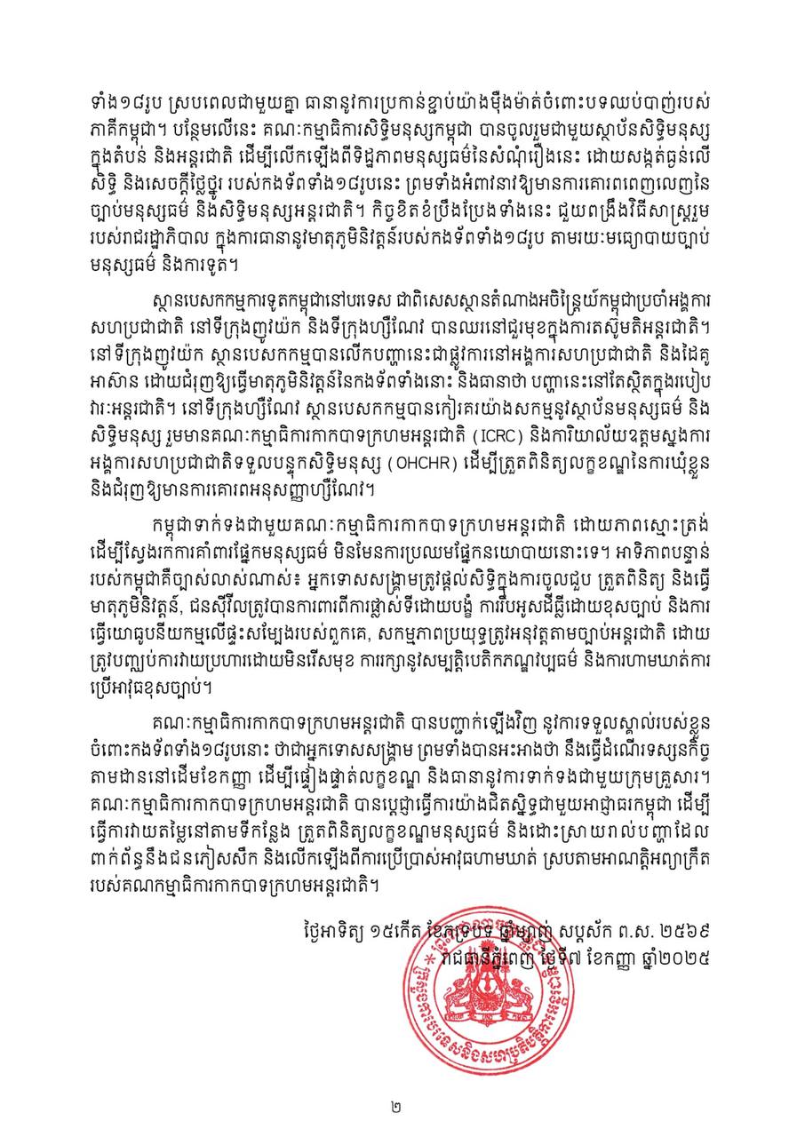 គណៈកម្មាធិការកាកបាទក្រហមអន្តរជាតិ បានបញ្ជាក់ឡើងវិញ នូវការទទួលស្គាល់របស់ខ្លួនចំពោះកងទ័ពទាំង១៨រូបនោះ ថាជាអ្នកទោសសង្គ្រាម ព្រមទាំងបានអះអាងថា នឹងធ្វើដំណើរទស្សនកិច្ចតាមដាននៅដើមខែកញ្ញ ដើម្បីផ្ទៀងផ្ទាត់លក្ខខណ្ឌ និងធានានូវការទាក់ទងជាមួយក្រុមគ្រួសារ។ គណៈកម្មាធិការកាកបាទក្រហមអន្តរជាតិ បានប្តេជ្ញាធ្វើការយ៉ាងជិតស្និទ្ធជាមួយអាជ្ញាធរកម្ពុជា ដើម្បីធ្វើការវាយតម្លៃនៅតាមទីកន្លែង ត្រួតពិនិត្យលក្ខខណ្ឌមនុស្សធម៌ និងដោះស្រាយរាល់បញ្ហាដែលពាក់ព័ន្ធនឹងជនភៀសសឹក និងលើកឡើងពីការប្រើប្រាស់អាវុធហាមឃាត់ ស្របតាមអាណត្តិអព្យាក្រឹតរបស់គណកម្មាធិការកាកបាទក្រហមអន្តរជាតិ៕