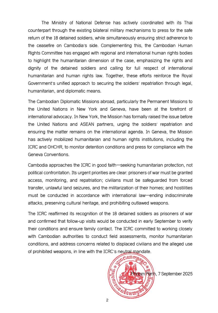 កម្ពុជាទាក់ទងជាមួយគណៈកម្មាធិការកាកបាទក្រហមអន្តរជាតិ ដោយភាពស្មោះត្រង់ដើម្បីស្វែងរកការគាំពារផ្នែកមនុស្សធម៌ មិនមែនការប្រឈមផ្នែកនយោបាយនោះទេ។ អាទិភាពបន្ទាន់របស់កម្ពុជាគឺច្បាស់លាស់ណាស់៖ អ្នកទោសសង្គ្រាមត្រូវផ្តល់សិទ្ធិក្នុងការចូលជួប ត្រួតពិនិត្យ និងធ្វើមាតុភូមិនិវត្តន៍, ជនស៊ីវីលត្រូវបានការពារពីការផ្លាស់ទីដោយបង្ខំ ការរឹបអូសដីធ្លីដោយខុសច្បាប់ និងការធ្វើយោធូបនីយកម្មលើផ្ទះសម្បែងរបស់ពួកគេ, សកម្មភាពប្រយុទ្ធត្រូវអនុវត្តតាមច្បាប់អន្តរជាតិ ដោយត្រូវបញ្ឈប់ការវាយប្រហារដោយមិនរើសមុខ ការរក្សានូវសម្បត្តិបេតិកភណ្ឌវប្បធម៌ និងការហាមឃាត់ការប្រើអាវុធខុសច្បាប់។