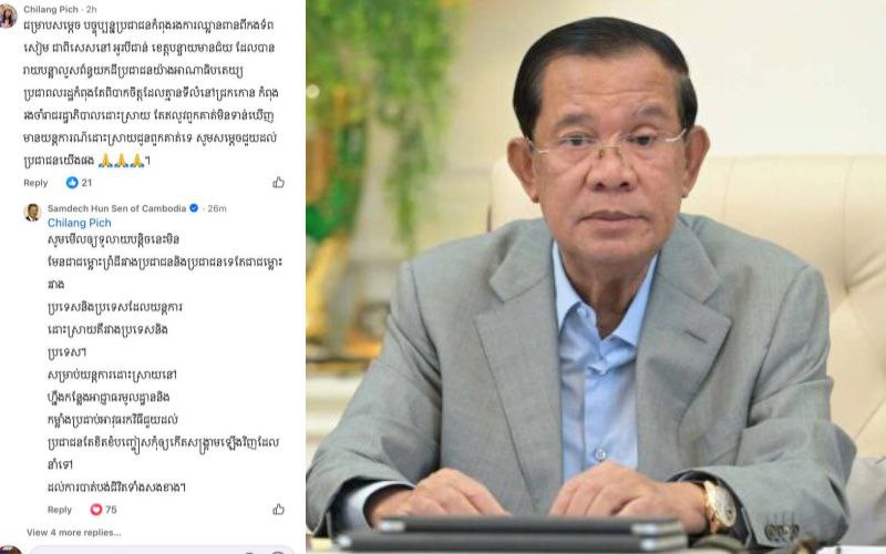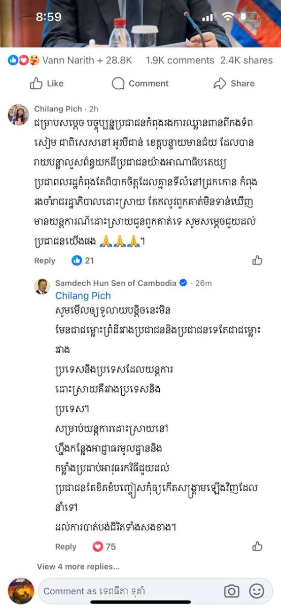 ការបញ្ជាក់បែបនេះរបស់សម្តេចតេជោ ក្នុងសំណេរតបខមមិនក្នុងហ្វេសប៊ុករបស់សម្តេចជាមួយគណនីហ្វេសប៊ុកឈ្មោះ Chilang Pich ដែលបានខមមិនក្នុងហ្វេសប៊ុកសម្តេចតេជោដោយលើកឡើងពីបញ្ហាកងទ័ពថៃរាយបន្លាលួសនៅក្នុងដីកម្ពុជា យកដីពលរដ្ឋកម្ពុជាក្នុងភូមិសាស្ត្រខេត្តបន្ទាយមានជ័យ ចំនុចឃុំអូរបីជាន់ ខណៈដែលម្ចាស់គណនីហ្វេសប៊ុកនេះបានសរសេរថា ប្រជាពលរដ្ឋកំពុងតែពិបាកចិត្តដែលគ្មានទីលំនៅជ្រកកោន កំពុងរងចាំរាជរដ្ឋាភិបាលដោះស្រាយ តែឥលូវពួកគាត់មិនទាន់ឃើញមានយន្តការណ៍ដោះស្រាយជូនពួកគាត់ទេនោះ សម្តេចតេជោ បានបញ្ជាក់ក្នុងសំណេរតបទៅវិញថា «សូមមើលឲ្យទូលាយបន្តិចនេះមិនមែនជាជម្លោះព្រំដីរវាងប្រជាជននិងប្រជាជនទេតែជាជម្លោះរវាងប្រទេសនិងប្រទេសដែលយន្តការដោះស្រាយគឺរវាងប្រទេសនិងប្រទេស។សម្រាប់យន្តការដោះស្រាយនៅហ្នឹងកន្លែងអាជ្ញាធរមូលដ្ឋាននិងកម្លាំងប្រដាប់អាវុធរកវិធីជួយដល់ប្រជាជនតែខិតខំបញ្ចៀសកុំឲ្យកើតសង្រ្គាមឡើងវិញដែលនាំទៅដល់ការបាត់បង់ជិវិតទាំងសងខាង។»