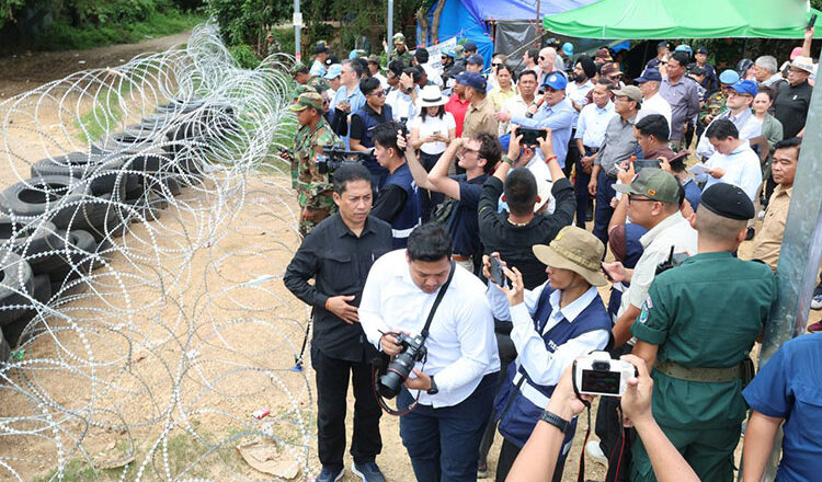 A delegation of ambassadors and UN and NGO representatives inspect the encroachment activities of Thailand, in Prey Chan village, Banteay Meanchey province, on August 22. AKP