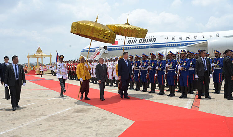 Chinese President Xi Jinping (R) inspects an honour guard alongside King Norodom Sihamoni at Phnom Penh International Airport on April 17. KT/Khem Sovannara