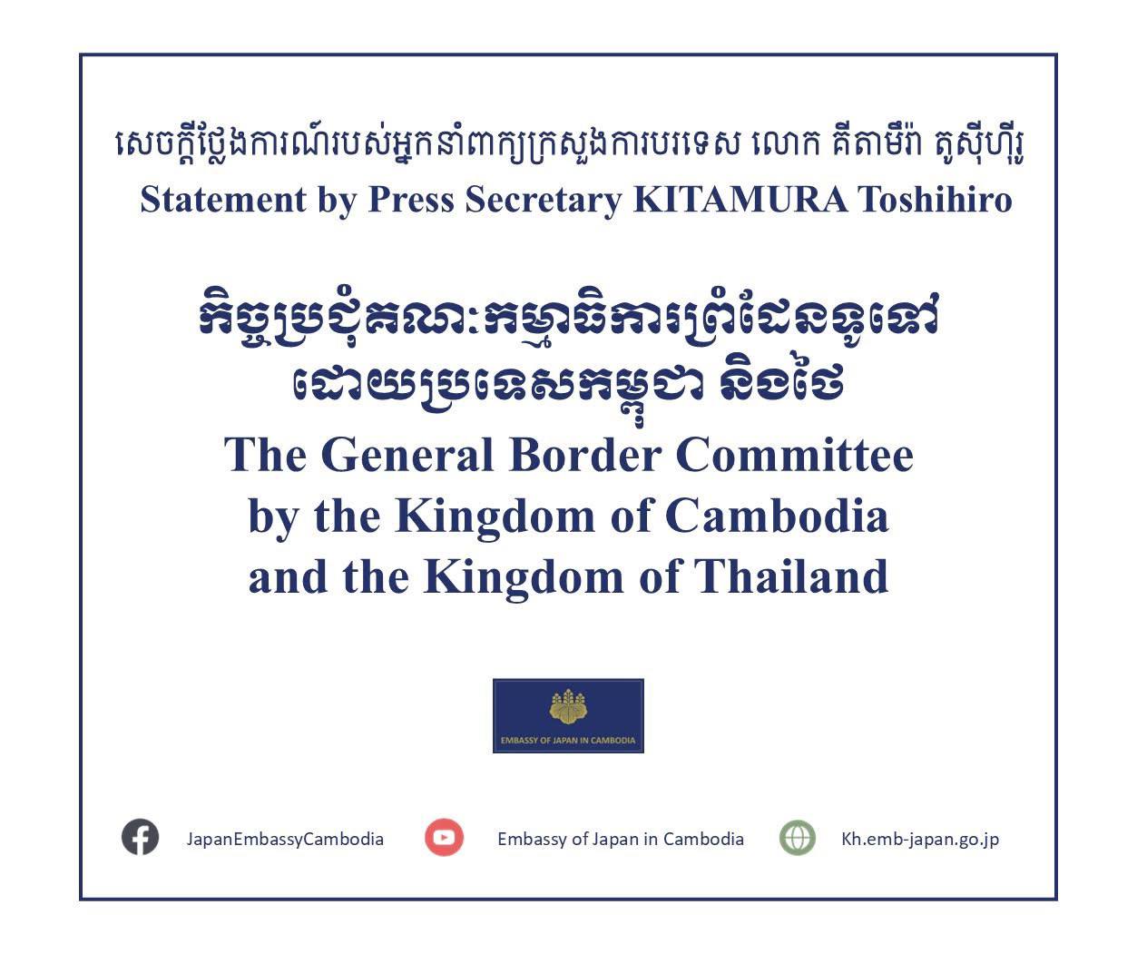 រដ្ឋាភិបាលជប៉ុន សាទរលទ្ធផលកិច្ចប្រជុំគណៈកម្មាធិការព្រំដែនទូទៅកម្ពុជា-ថៃ និងប្តេជ្ញាបន្តខិតខំប្រឹងប្រែងជំរុញការអនុវត្តយ៉ាងប្រាកដប្រជា នូវកិច្ចព្រមព្រៀងបទឈប់បាញ់