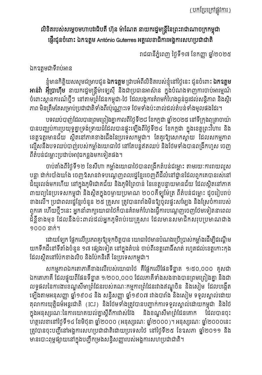សារលិខិតរបស់ សម្តេចមហាបវរធិបតី ហ៊ុន ម៉ាណែត នាយករដ្ឋមន្ត្រីនៃព្រះរាជាណាចក្រកម្ពុជា ជូនចំពោះឯកឧត្តម António Guterres អគ្គលេខាធិការអង្គការសហប្រជាជាតិ