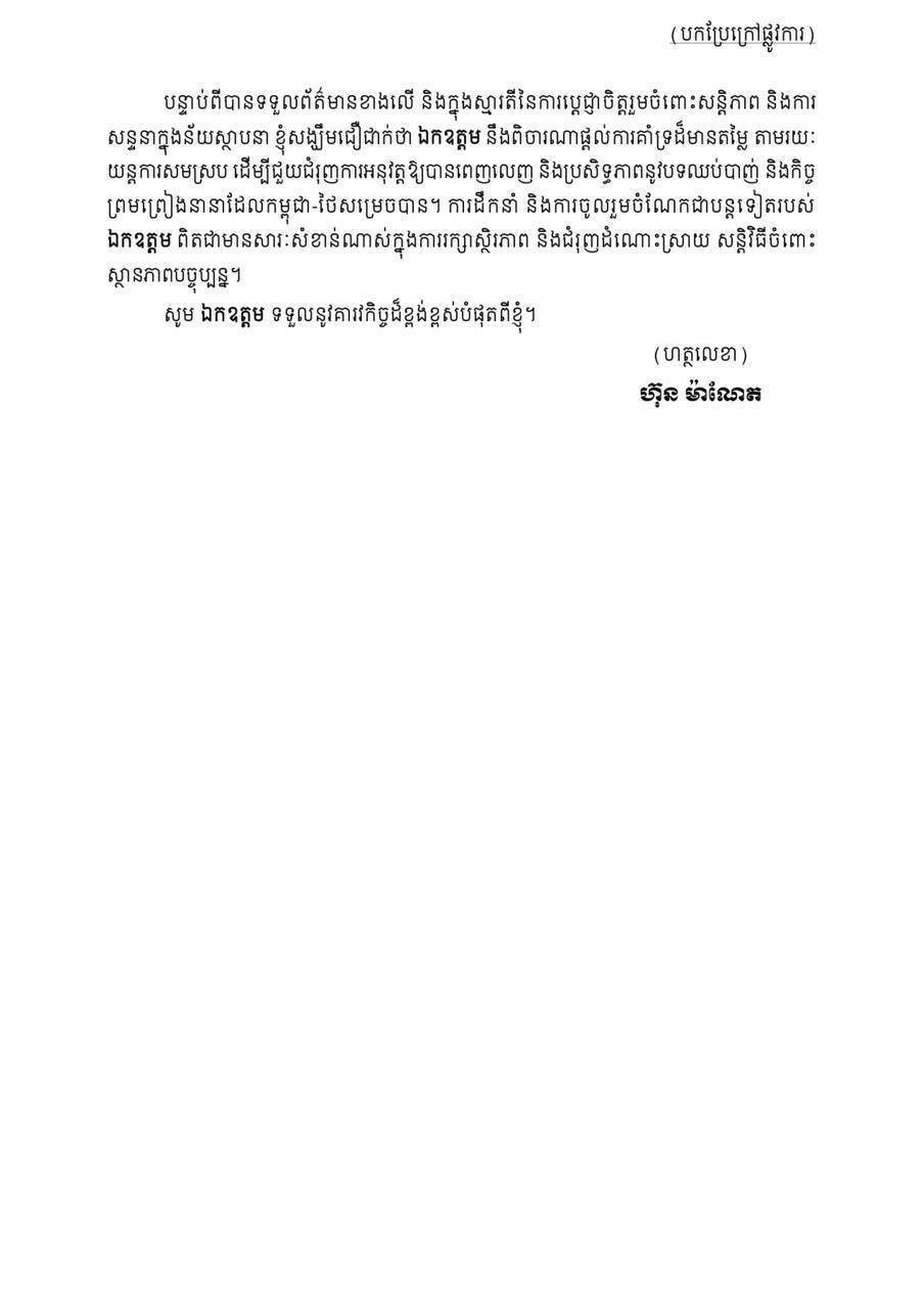 សារលិខិតរបស់ សម្តេចមហាបវរធិបតី ហ៊ុន ម៉ាណែត នាយករដ្ឋមន្ត្រីនៃព្រះរាជាណាចក្រកម្ពុជា ជូនចំពោះឯកឧត្តម António Guterres អគ្គលេខាធិការអង្គការសហប្រជាជាតិ សារលិខិតរបស់ សម្តេចមហាបវរធិបតី ហ៊ុន ម៉ាណែត នាយករដ្ឋមន្ត្រីនៃព្រះរាជាណាចក្រកម្ពុជា ជូនចំពោះឯកឧត្តម António Guterres អគ្គលេខាធិការអង្គការសហប្រជាជាតិ