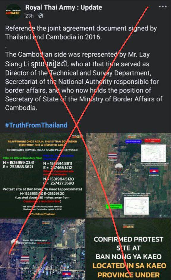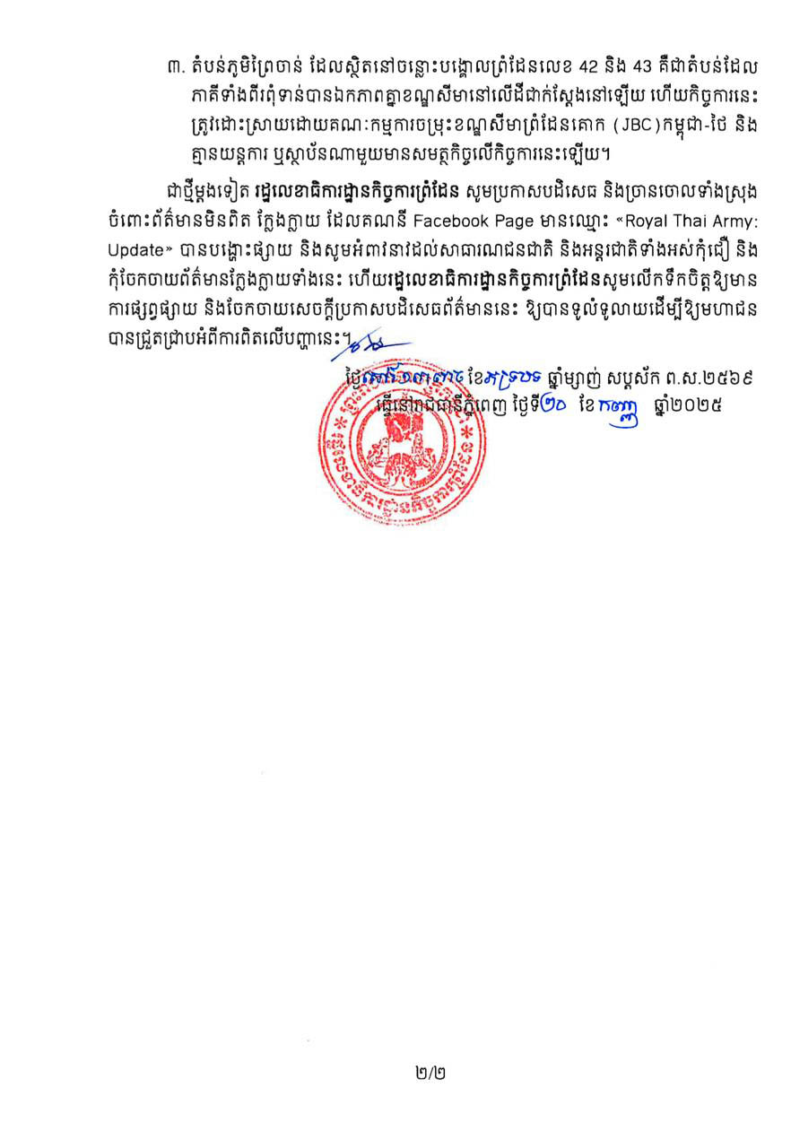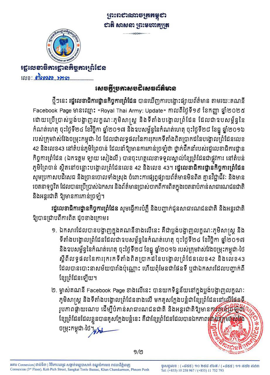 លេខាធិការដ្ឋានកិច្ចការព្រំដែន បញ្ជាក់ថា ឯកសារដែលផេកហ្វេសប៊ុកខាងលើបង្ហោះ គ្រាន់តែជាប្លង់បង្ហាញលក្ខណៈភូមិសាស្ត្រ និងទីតាំងបង្គោលព្រំដែនដែលជាឧបសម្ព័ន្ធនៃកំណត់ហេតុចុះថ្ងៃទី២៤ ខែវិច្ឆិកា ឆ្នាំ២០១៧ និងឧបសម្ព័ន្ធនៃកំណត់ហេតុចុះថ្ងៃទី២៨ ខែធ្នូ ឆ្នាំ២០១៦ របស់ក្រុមវាស់វែងចម្រុះកម្ពុជា-ថៃ ស្តីពីលទ្ធផលនៃការរុករកទីតាំងពិតប្រាកដនៃបង្គោលព្រំដែនលេខ៤២ និងលេខ៤៣ ដែលបានបោះនាសម័យបារាំងប៉ុណ្ណោះ ហើយពុំមែនជាផែនទី ឬឯកសារដែលបញ្ជាក់ពីខ្សែព្រំដែនឡើយ។