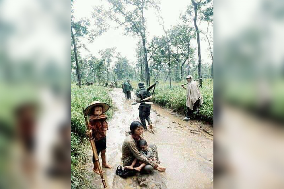 Soldiers march south, as a woman and her children sit, disconsolate, in the rain. This photograph was likely taken near Ang Sila in 1982, along the road leading to the Nong Chan refugee camp. Supplied