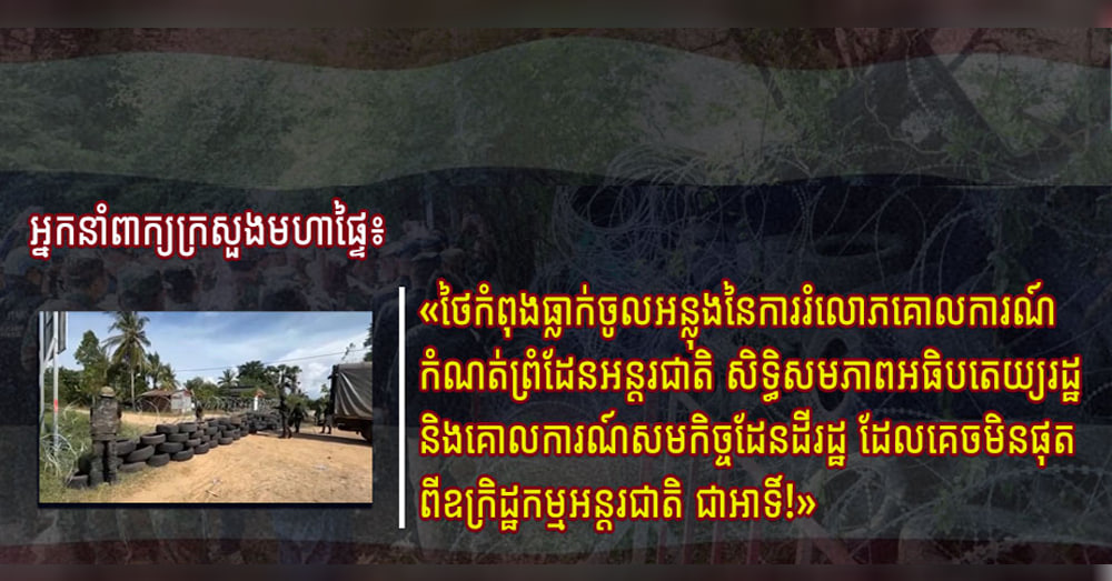 អ្នកនាំពាក្យក្រសួងមហាផ្ទៃ៖ «ថៃកំពុងធ្លាក់ចូលអន្លុងនៃការរំលោភគោលការណ៍កំណត់ព្រំដែនអន្តរជាតិ សិទ្ធិសមភាពអធិបតេយ្យរដ្ឋ និងគោលការណ៍សមកិច្ចដែនដីរដ្ឋ ដែលគេចមិនផុតពីឧក្រិដ្ឋកម្មអន្តរជាតិ ជាអាទិ៍!»