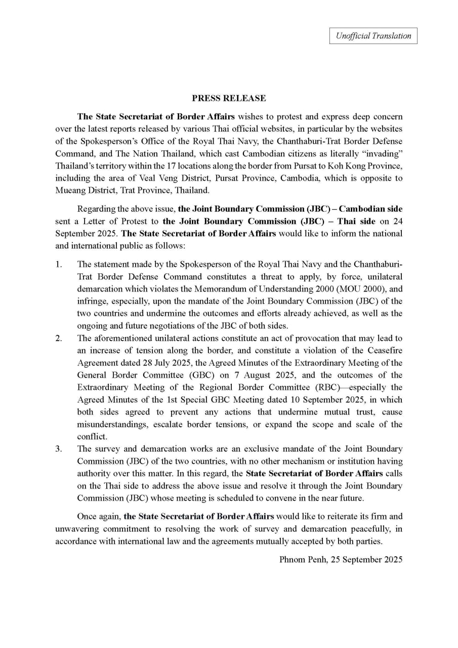 Regarding the above issue, the Joint Boundary Commission (JBC) – Cambodian side sent a Letter of Protest to the Joint Boundary Commission (JBC) – Thai side on 24 September 2025. The State Secretariat of Border Affairs would like to inform the national and international public as follows: