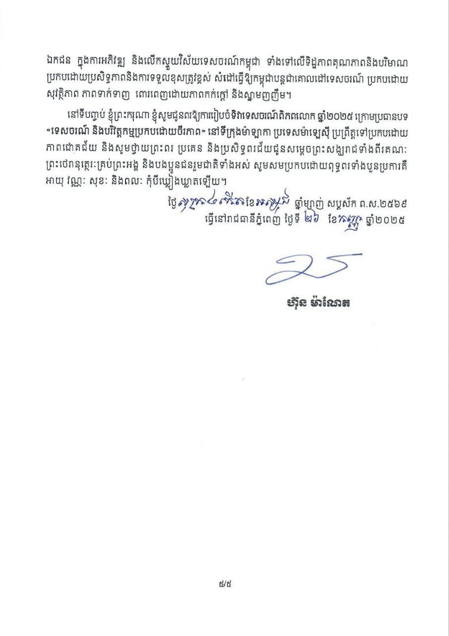សារលិខិត សម្តេចមហាបវរធិបតី ហ៊ុន ម៉ាណែត នាយករដ្ឋមន្ត្រី នៃព្រះរាជាណាចក្រកម្ពុជា ក្នុងឱកាសអបអរសាទរទិវាទេសចរណ៍ពិភពលោក ឆ្នាំ២០២៥ ក្រោមប្រធានបទ «ទេសចរណ៍ និងបរិវត្តកម្មប្រកបដោយចីរភាព»