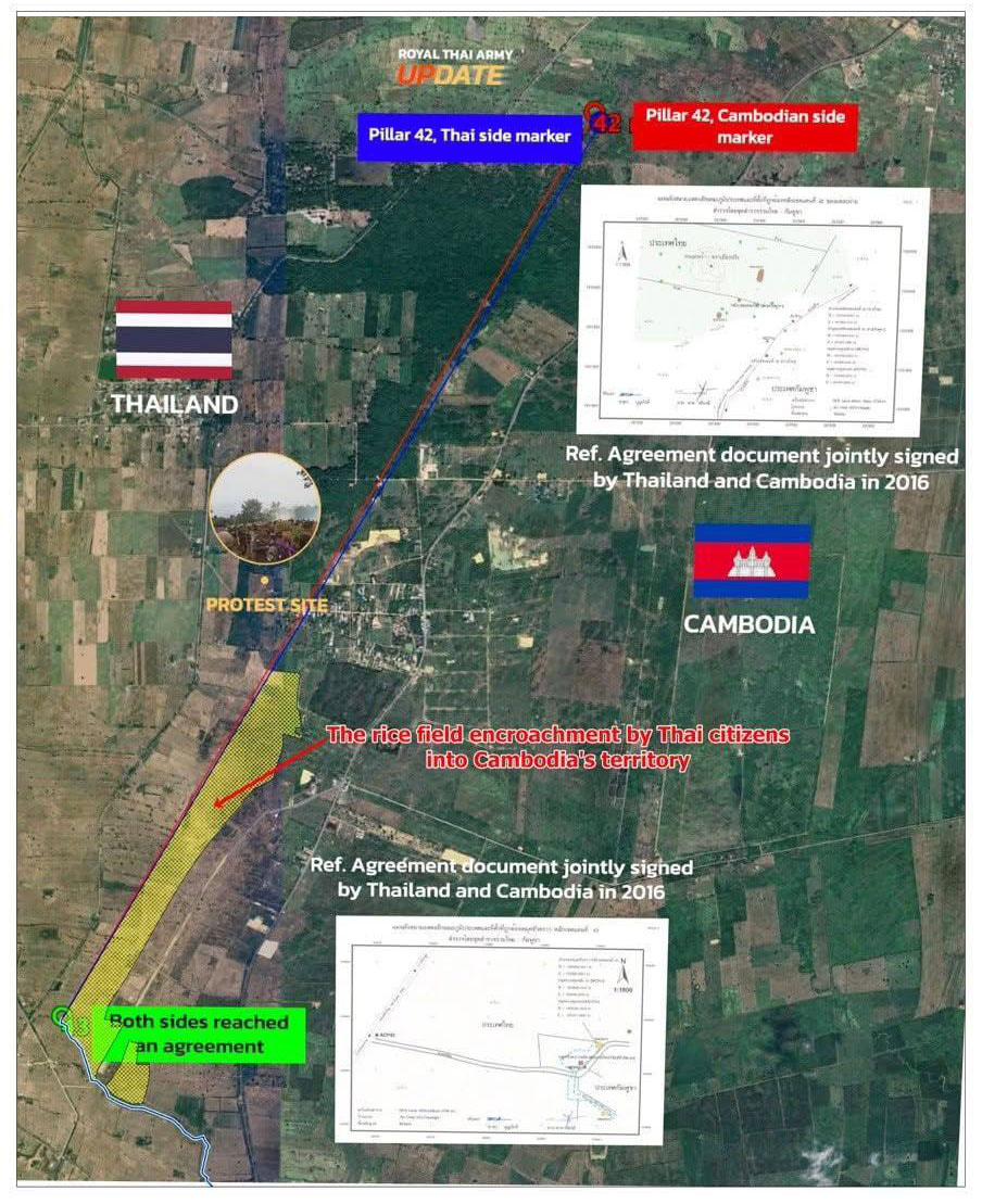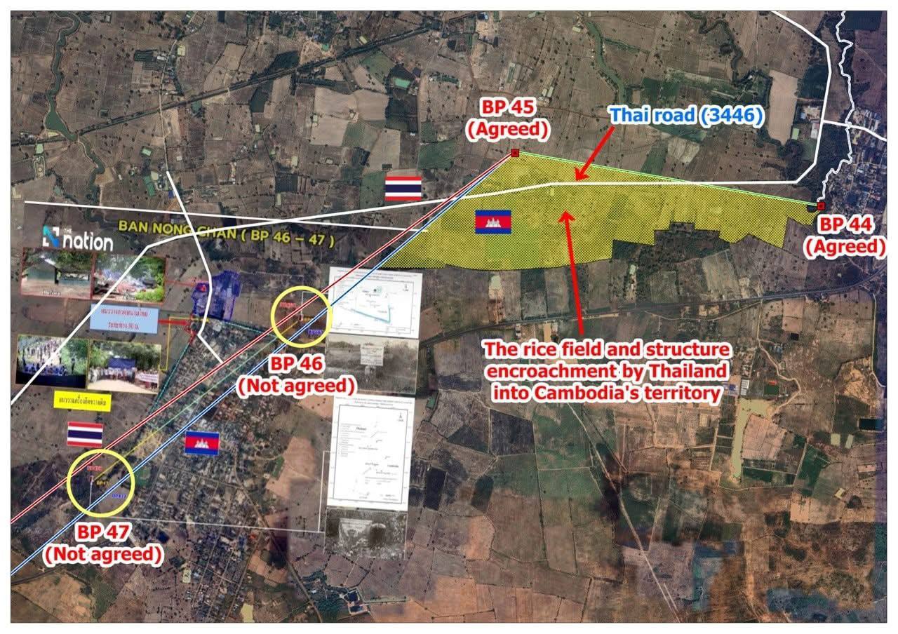 But even by the virtue of this unofficial unilaterally drawn borderline between BP 42-43 (Prey Chan Village) and BP 44-47 (Chouk Chey Village) in the infographics presented by the Thai side, the reality on the ground is that Thai people have been occupying and farming for years many hectares of land situated well within Cambodian territory— as shown in the attached maps / infographics of the areas.