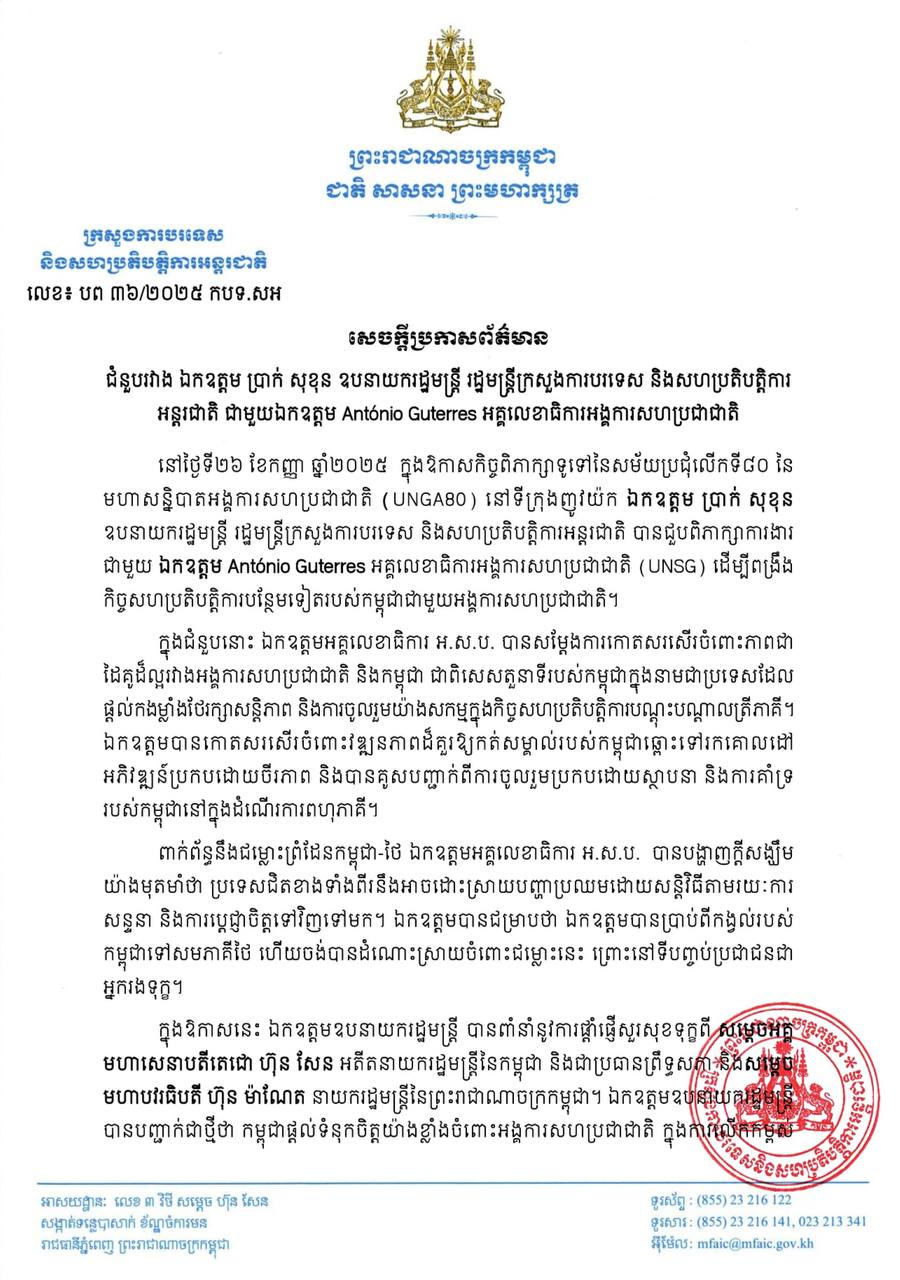 ជំនួបរវាង ឯកឧត្តម ប្រាក់ សុខុន ឧបនាយករដ្ឋមន្ត្រី រដ្ឋមន្ត្រីក្រសួងការបរទេស និងសហប្រតិបត្តិការអន្តរជាតិ ជាមួយឯកឧត្តម António Guterres អគ្គលេខាធិការអង្គការសហប្រជាជាតិ