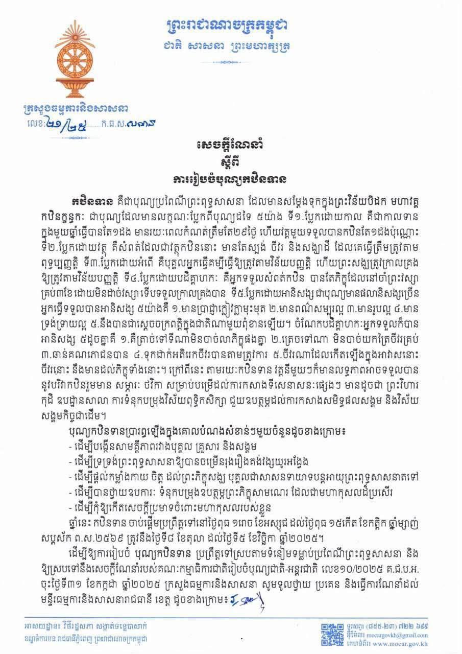 ឆ្នាំនេះ បុណ្យកឋិនទាន ចាប់ផ្តើមពីថ្ងៃទី៨ ខែតុលា ដល់ថ្ងៃទី៥ ខែវិច្ឆិកា ឆ្នាំ២០២៥