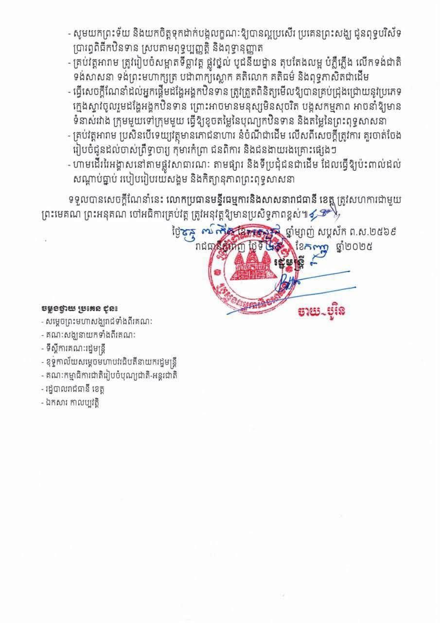 ឆ្នាំនេះ កឋិនទាន ចាប់ផ្តើមប្រព្រឹត្តទៅនៅថ្ងៃពុធ ១រោច ខែអស្សុជ ដល់ថ្ងៃពុធ ១៥កើត ខែកត្តិក ឆ្នាំម្សាញ់ សប្តស័ក ព.ស.២៥៦៩ ត្រូវនឹងថ្ងៃទី៨ ខែតុលា ដល់ថ្ងៃទី៥ ខែវិច្ឆិកា ឆ្នាំ២០២៥៕