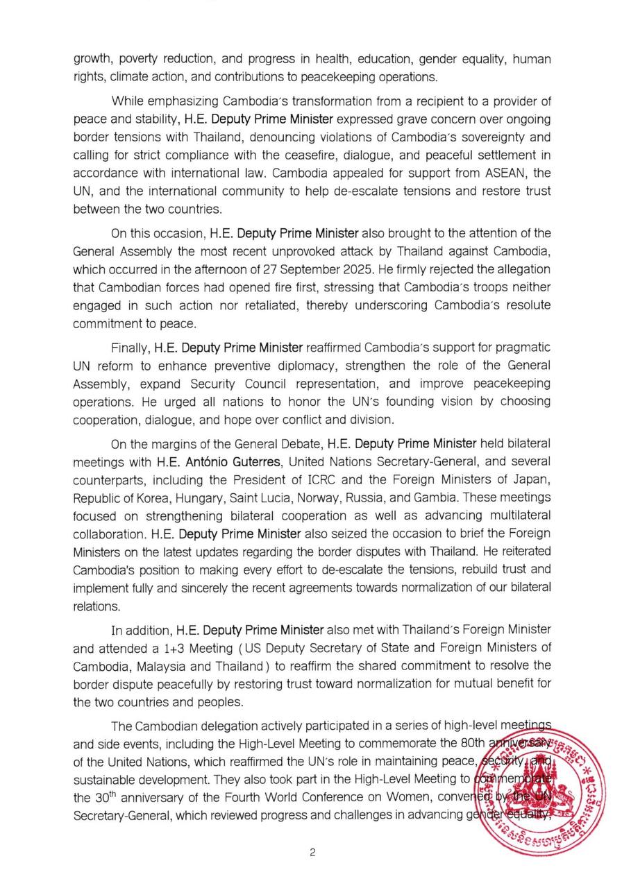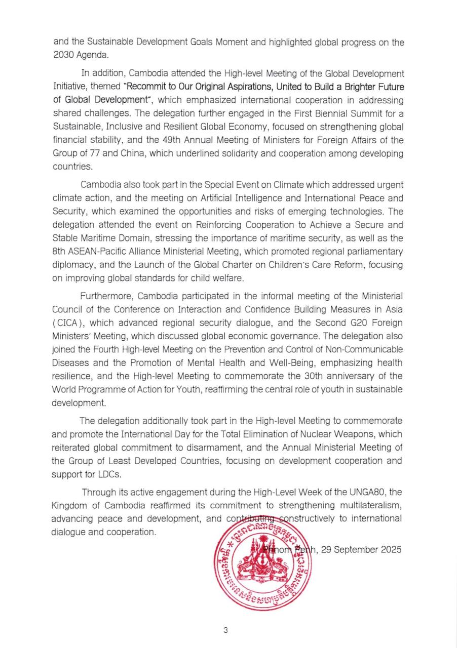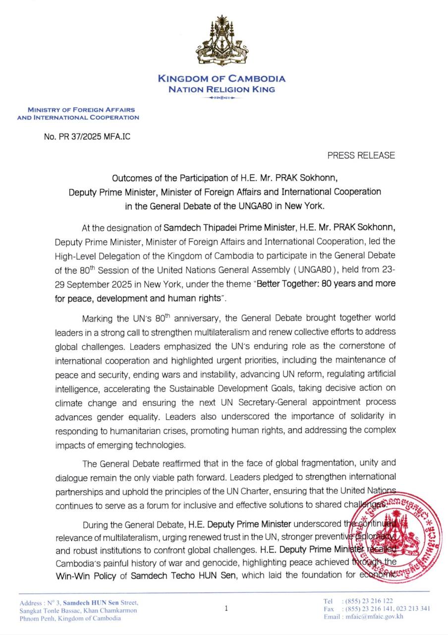 Outcomes of the Participation of H.E. Mr. PRAK Sokhonn, Deputy Prime Minister, Minister of Foreign Affairs and International Cooperation in the General Debate of the UNGA80 in New York Outcomes of the Participation of H.E. Mr. PRAK Sokhonn, Deputy Prime Minister, Minister of Foreign Affairs and International Cooperation in the General Debate of the UNGA80 in New York