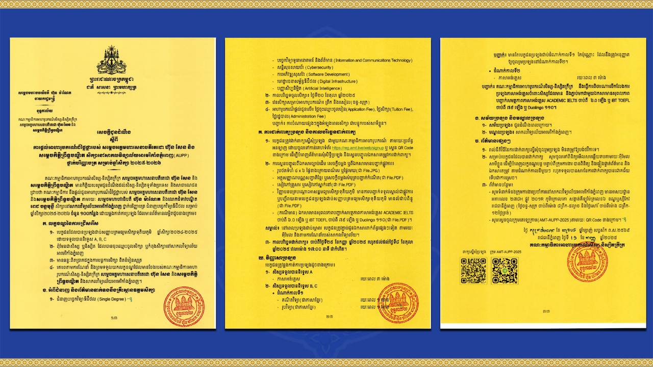 ១. សាកលវិទ្យាល័យអាមេរិកាំងភ្នំពេញ (AUPP) ថ្នាក់បរិញ្ញាបត្រ ជំនាញបច្ចេកវិទ្យាឌីជីថល សម្រាប់ឆ្នាំសិក្សា ២០២៥-២០២៦ ចំនួន ១០០ កន្លែង ដោយឆ្លងកាត់ការប្រឡង។ កាលបរិច្ឆេទទទួលពាក្យ៖ ចាប់ពីថ្ងៃជូនដំណឹងនេះ រហូតដល់ថ្ងៃទី៨ ខែតុលា ឆ្នាំ២០២៥ វេលាម៉ោង ១៧:០០ នាទី ជាកំហិត។ ព័ត៌មានបន្ថែម: https://t.me/+ECO3_AHMAz8xZTZl