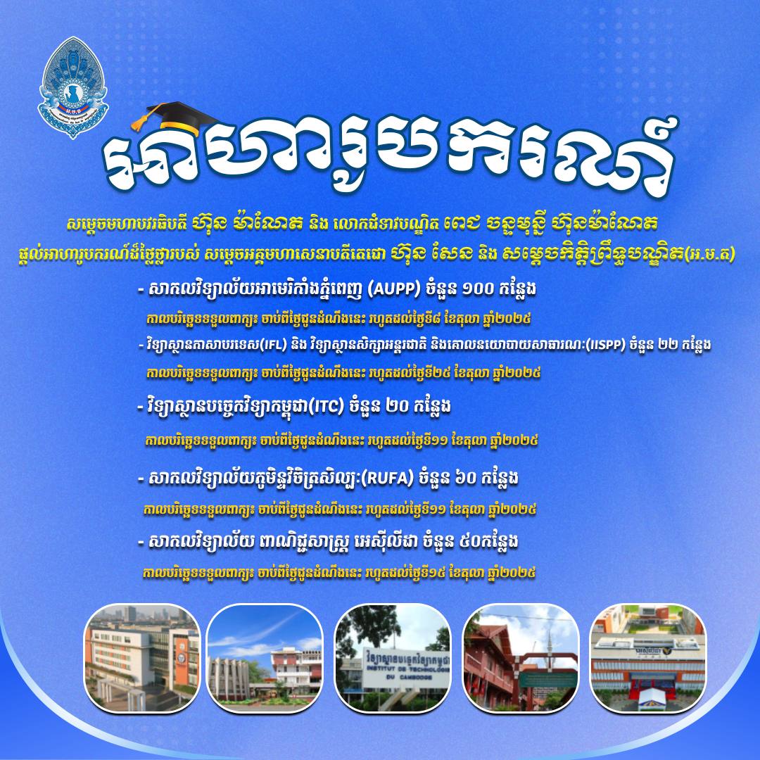 ៣. វិទ្យាស្ថានបច្ចេកវិទ្យាកម្ពុជា(ITC) កម្រិតវិស្វករ សម្រាប់ឆ្នាំសិក្សា ២០២៥-២០២៦ ដោយឆ្លងកាត់ការប្រឡង។ កាលបរិច្ឆេទទទួលពាក្យ៖ ចាប់ពីថ្ងៃជូនដំណឹងនេះ រហូតដល់ថ្ងៃទី១១ ខែតុលា ឆ្នាំ២០២៥ វេលាម៉ោង ១៧:០០ នាទី ជាកំហិត។ ព័ត៌មានបន្ថែម: https://t.me/+JCYtLfB2Yu40MWM1