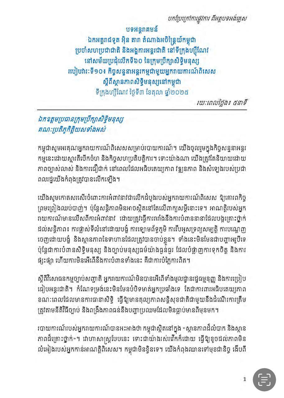 បទអន្តរាគមន៍ របស់ ឯកអគ្គរាជទូត អ៊ុន តារា តំណាងអចិន្ត្រៃយ៍កម្ពុជា ប្រចាំសហប្រជាជាតិ និងអង្គការអន្តរជាតិ នៅទីក្រុងហ្សឺណែវ នៅសម័យប្រជុំលើកទី៦០ នៃក្រុមប្រឹក្សាសិទ្ធិមនុស្ស របៀបវារៈទី១០៖ កិច្ចសន្ទនាអន្តរកម្មជាមួយអ្នករាយការណ៍ពិសេស ស្តីពីស្ថានភាពសិទ្ធិមនុស្សនៅកម្ពុជា