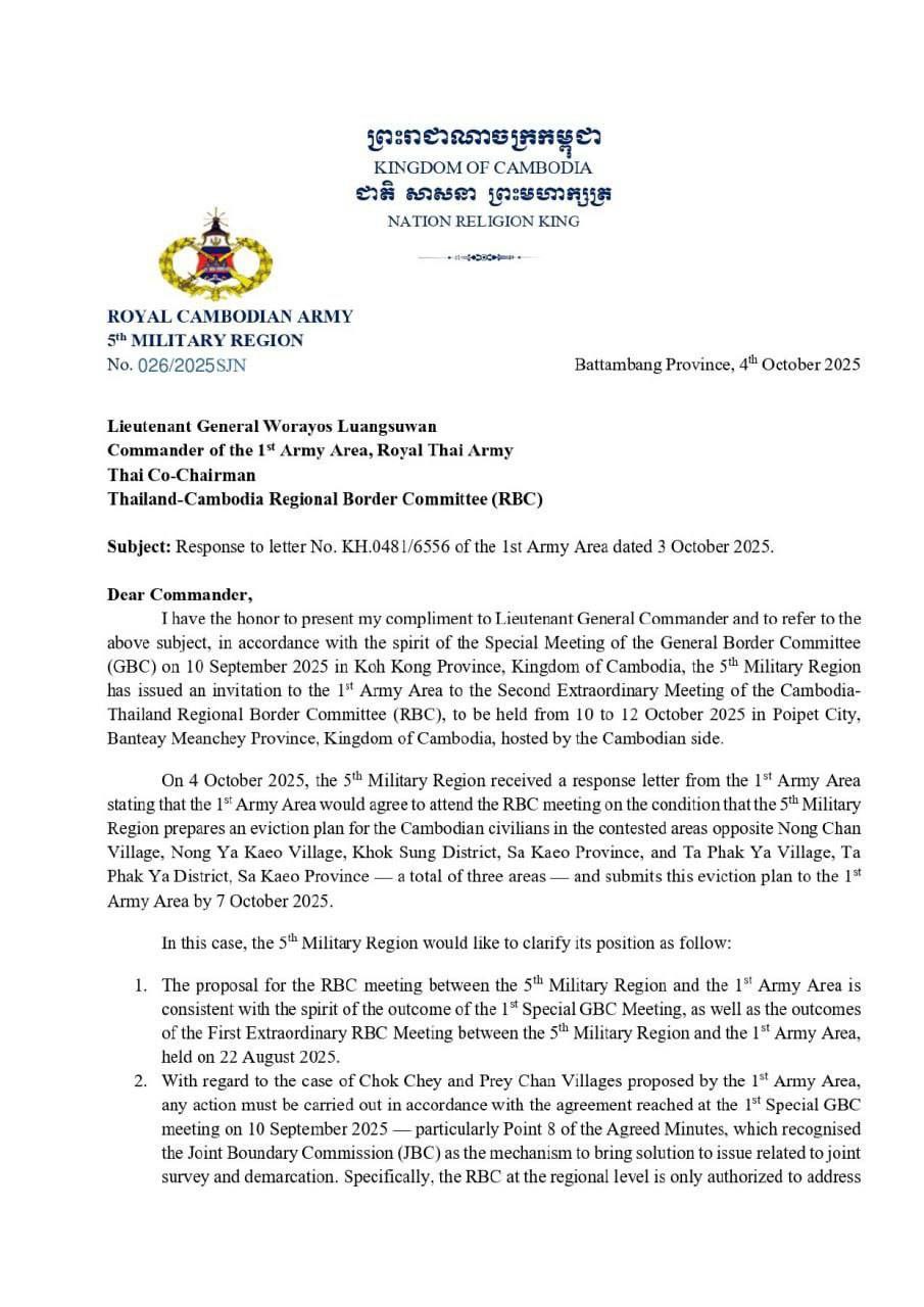 ‘I have the honor to present my compliment to Lieutenant General Commander and to refer to the above subject, in accordance with the spirit of the Special Meeting of the General Border Committee (GBC) on 10 September 2025 in Koh Kong Province, Kingdom of Cambodia, the 5th Military Region has issued an invitation to the 1 Army Area to the Second Extraordinary Meeting of the Cambodia-Thailand Regional Border Committee (RBC), to be held from 10 to 12 October 2025 in Poipet City, Banteay Meanchey Province, Kingdom of Cambodia, hosted by the Cambodian side.