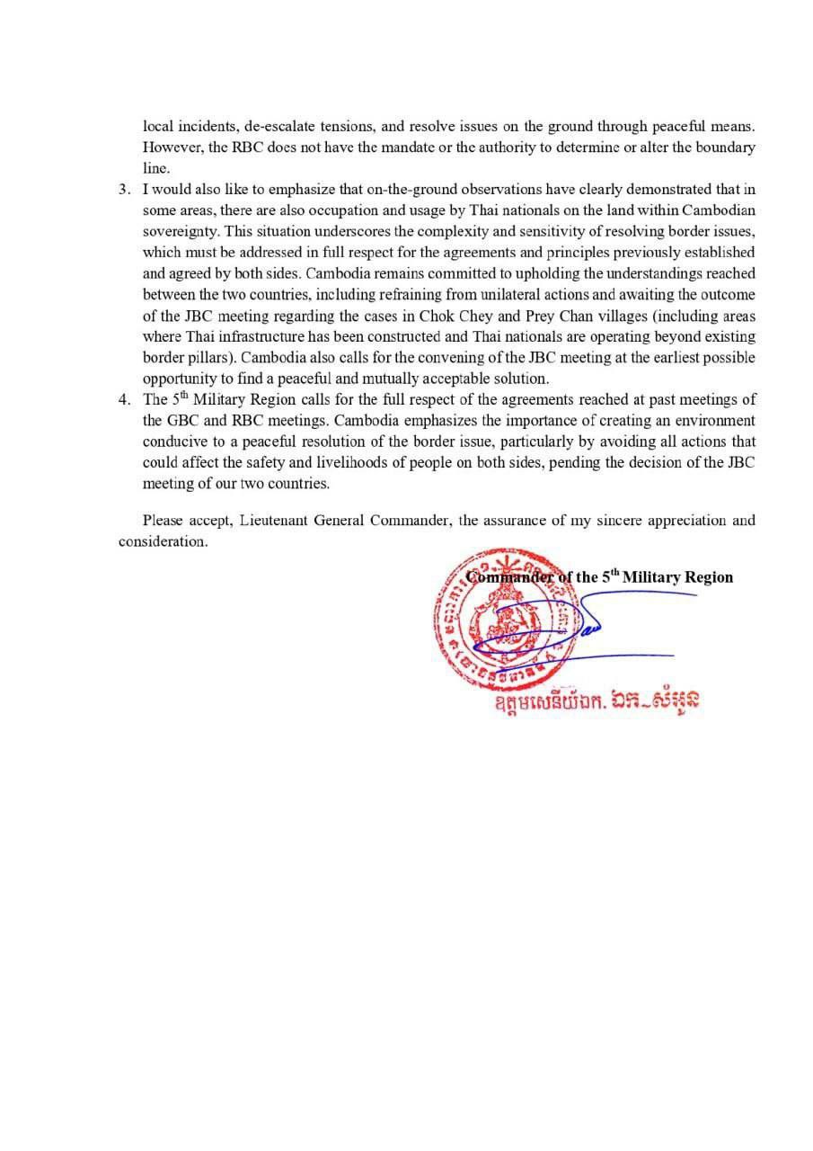 4. The 5th Military Region calls for the full respect of the agreements reached at past meetings of the GBC and RBC meetings. Cambodia emphasizes the importance of creating an environment conducive to a peaceful resolution of the border issue, particularly by avoiding all actions that could affect the safety and livelihoods of people on both sides, pending the decision of the JBC meeting of our two countries.’